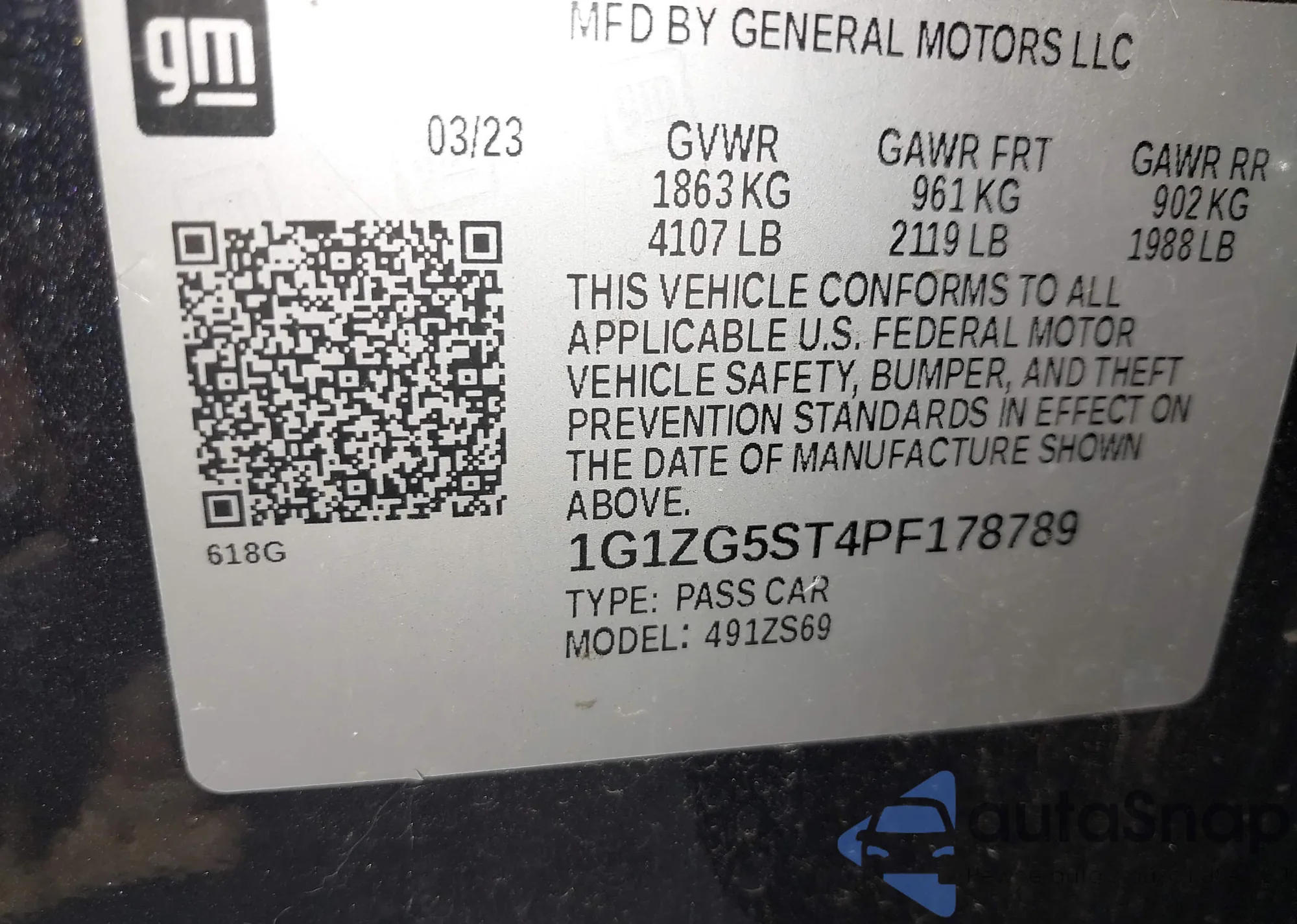 • VIN 1G1ZG5ST4PF178789