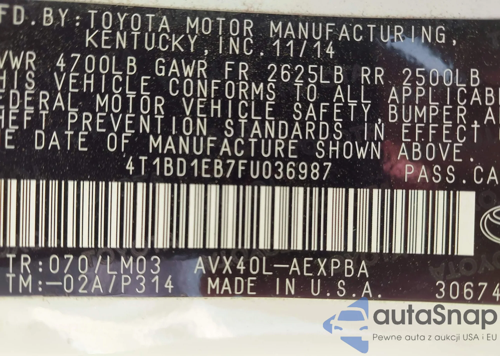 • VIN 4T1BD1EB7FU036987