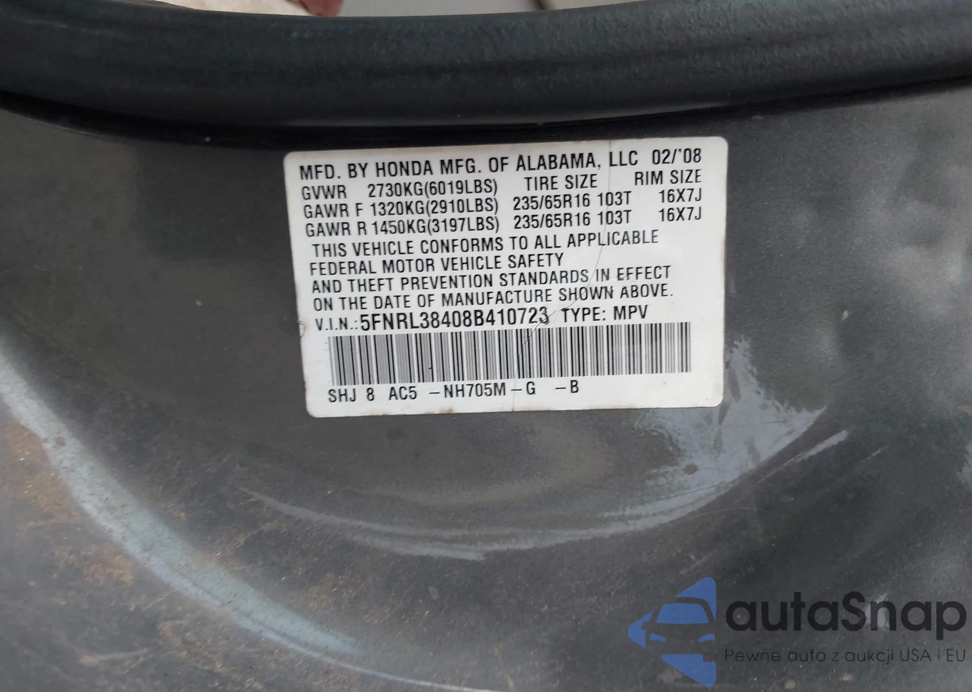 • VIN 5FNRL38408B410723