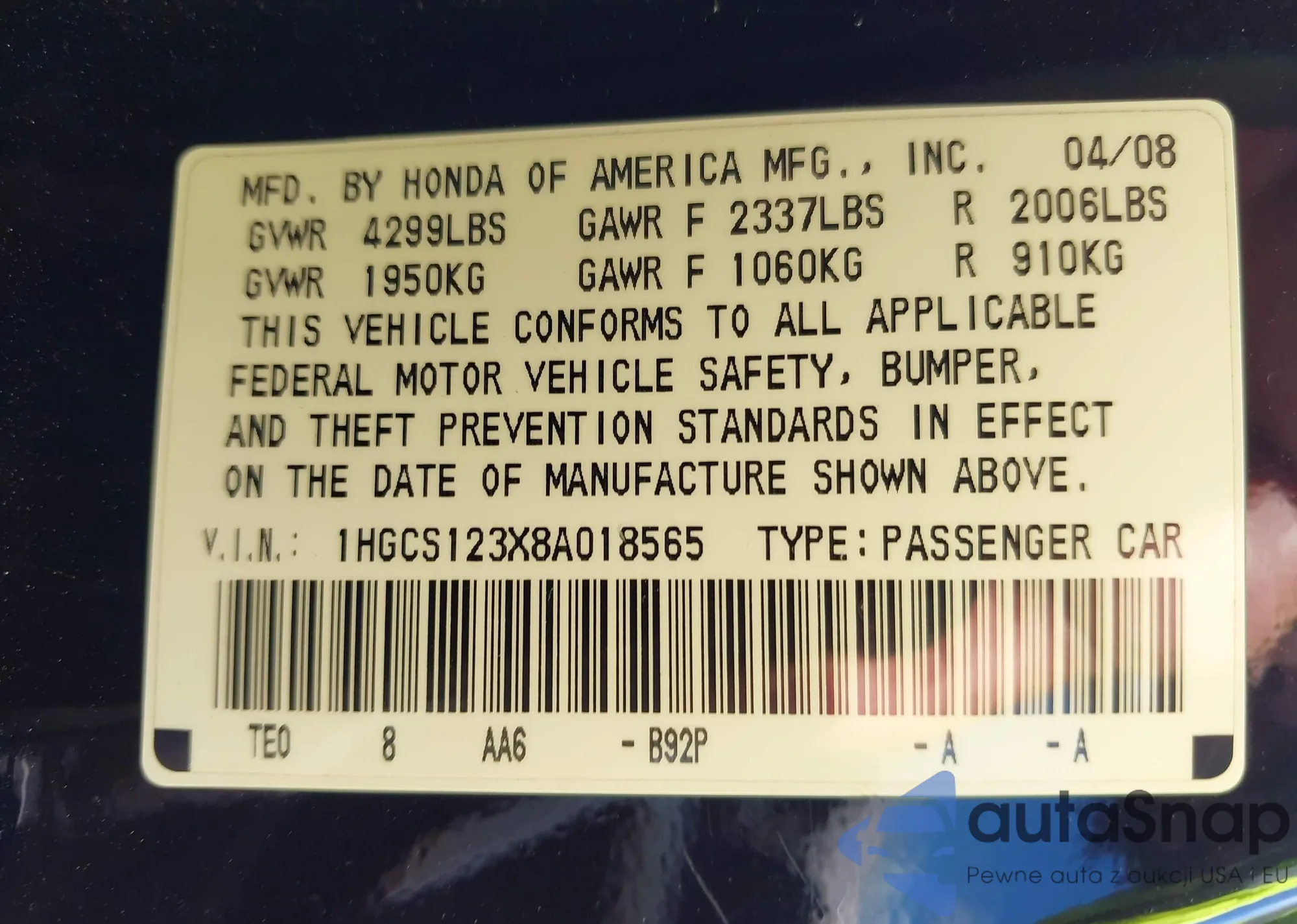 LOT: 43327199 VIN: 1HGCS123X8A018565