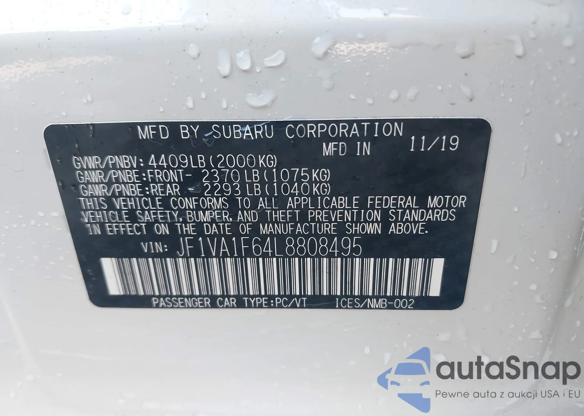 LOT: 43163324 VIN: JF1VA1F64L8808495