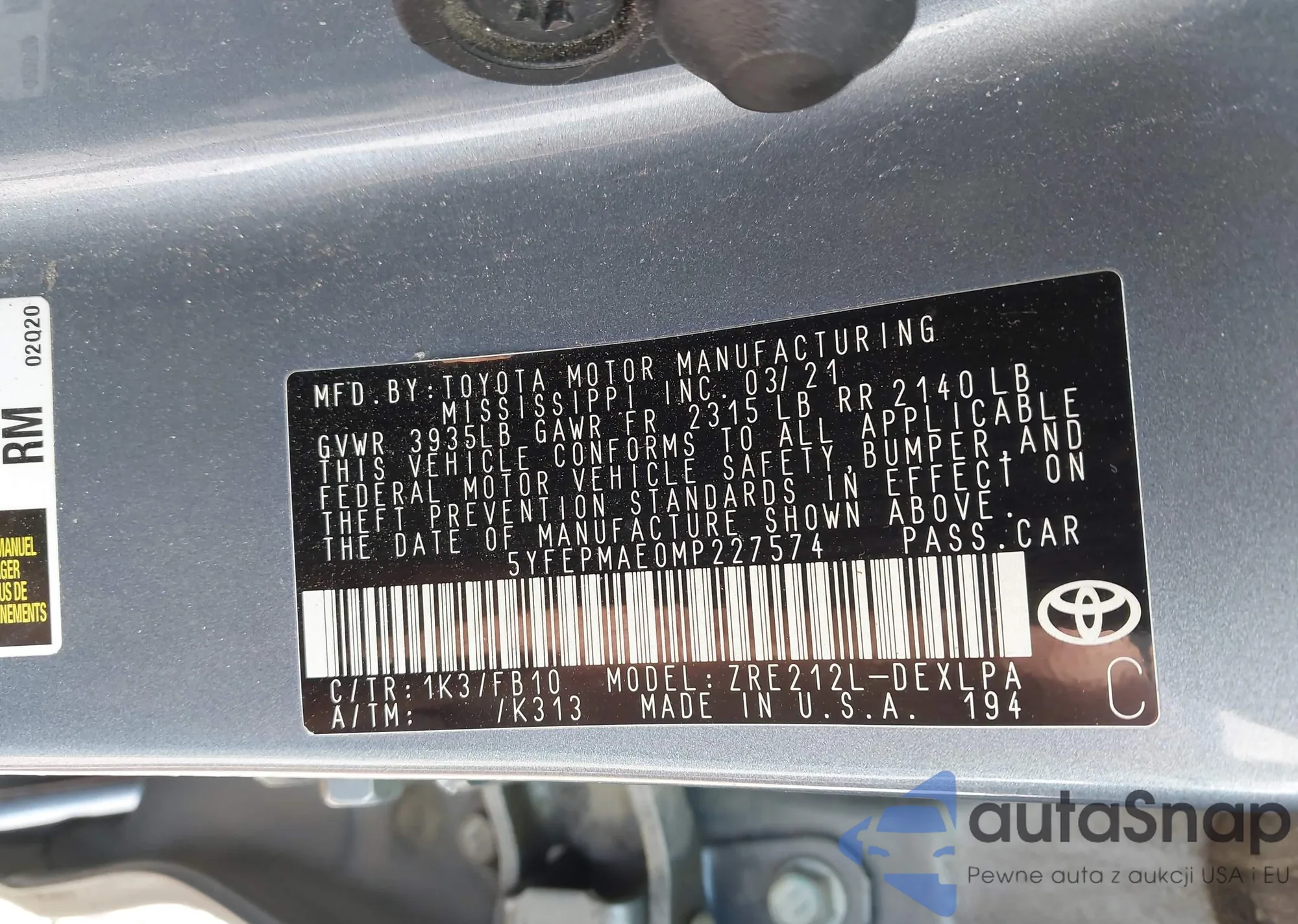 LOT: 43203792 VIN: 5YFEPMAE0MP227574