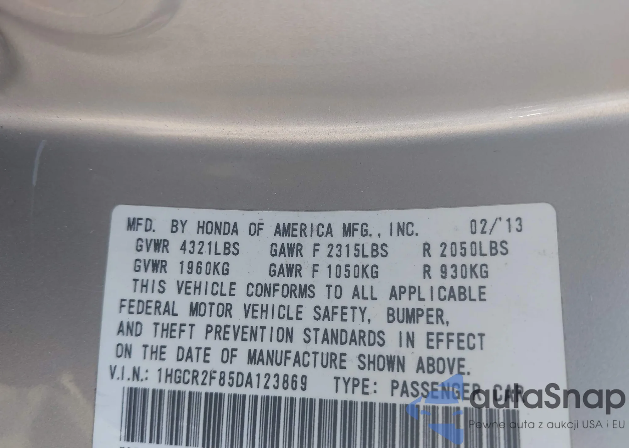 • VIN 1HGCR2F85DA123869