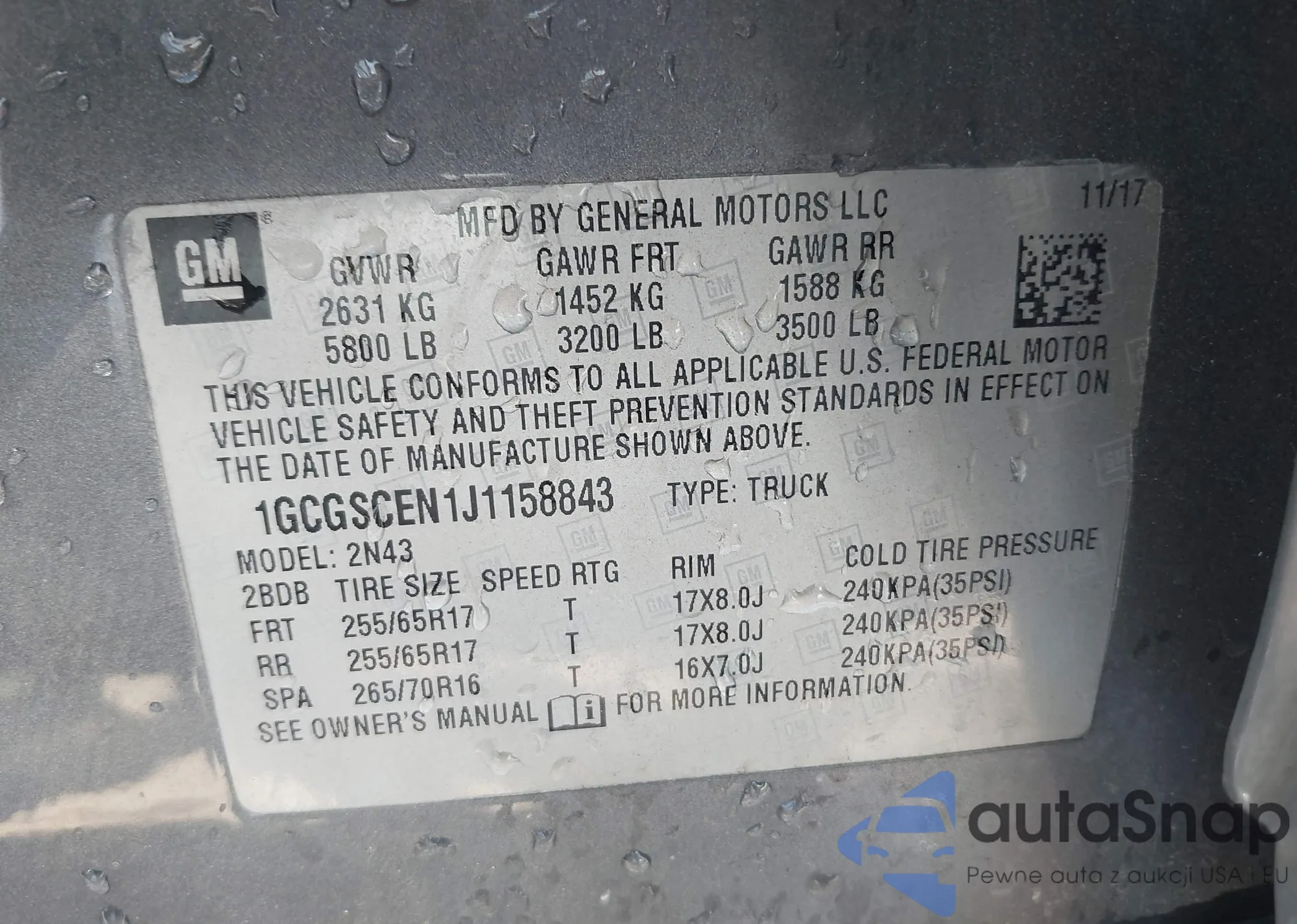 LOT: 43137187 VIN: 1GCGSCEN1J1158843