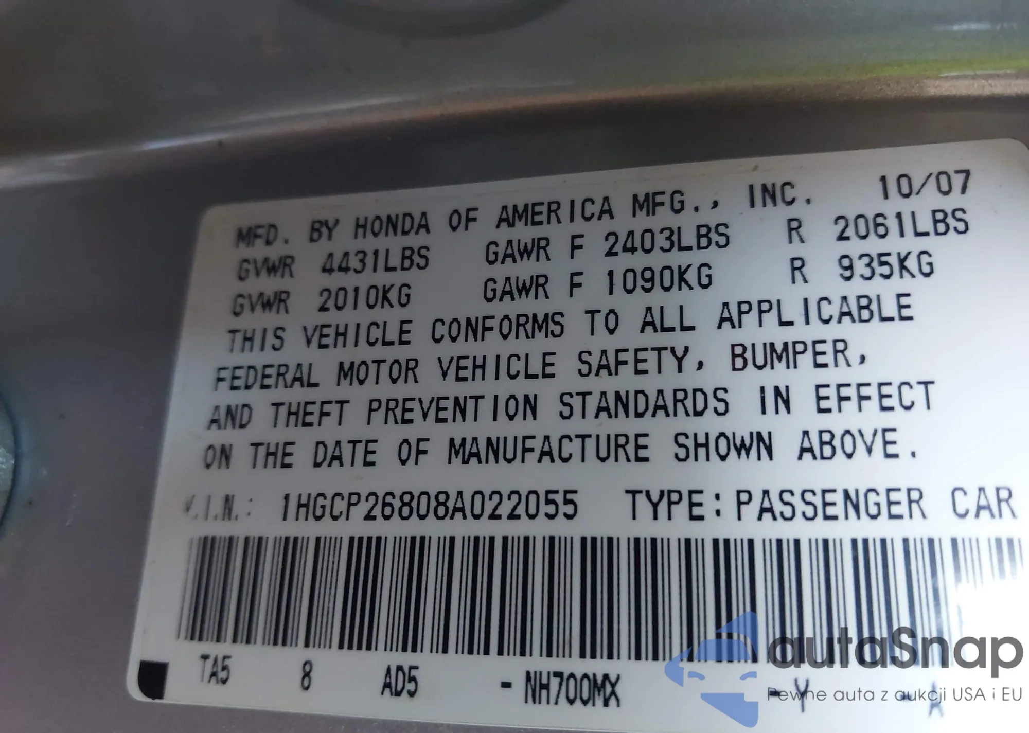 • VIN 1HGCP26808A022055