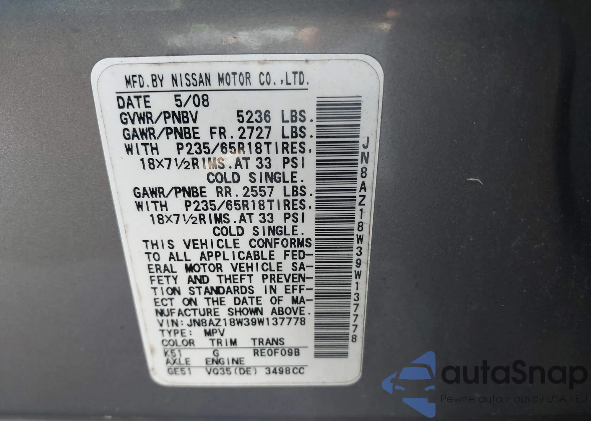 • VIN JN8AZ18W39W137778
