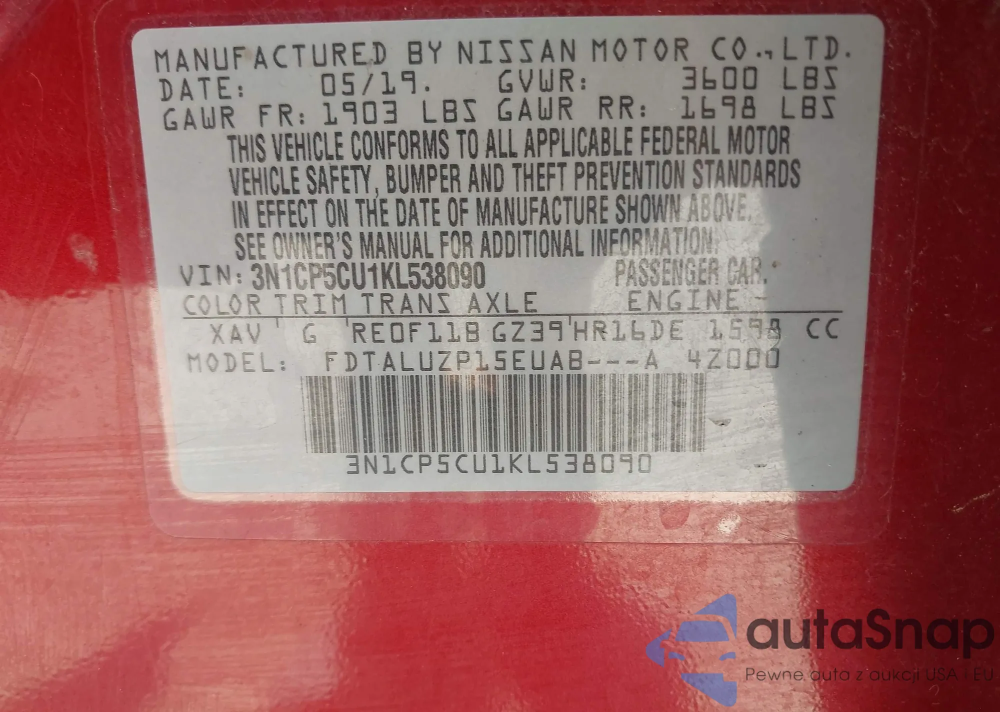 LOT: 43258992 VIN: 3N1CP5CU1KL538090