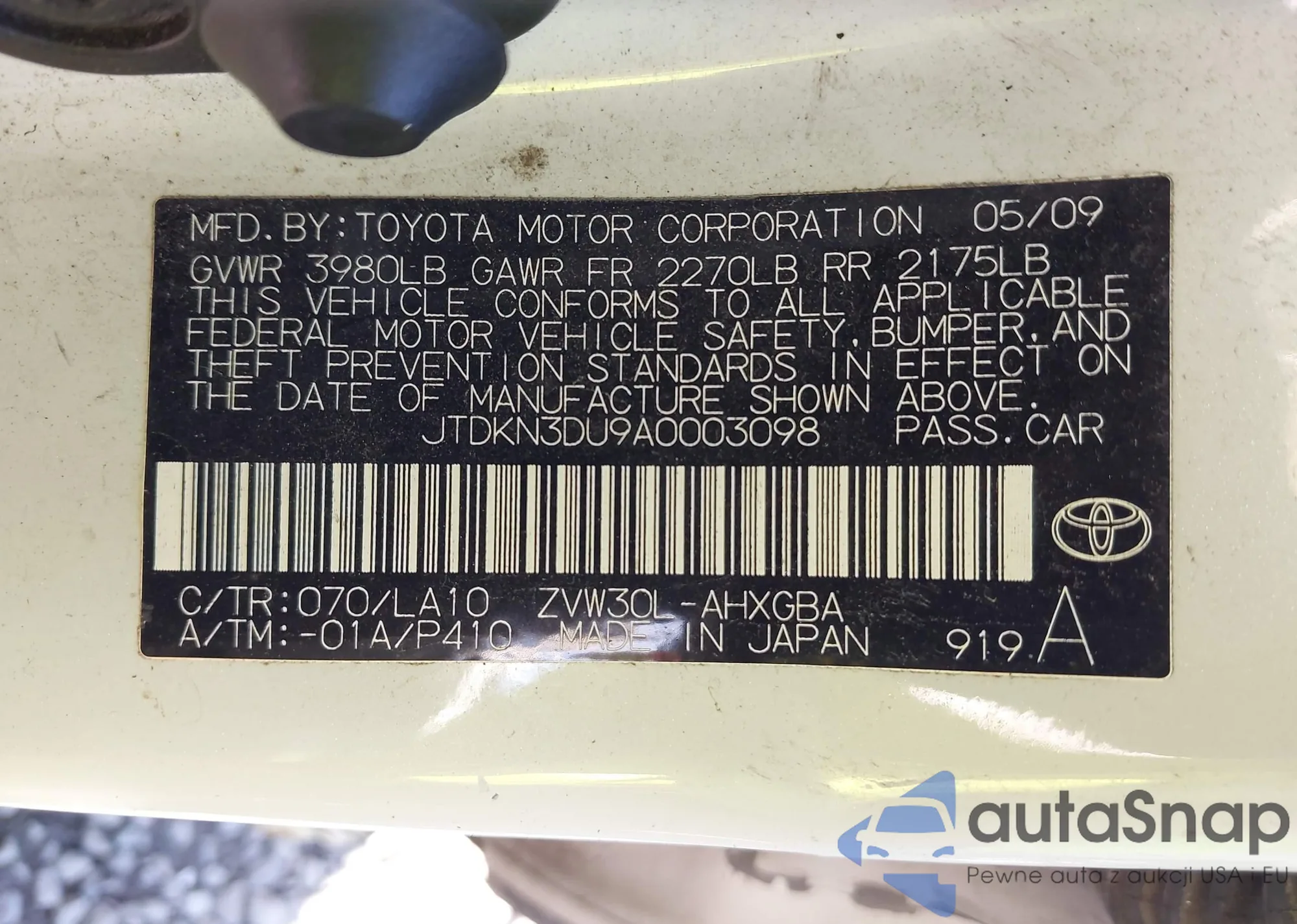 LOT: 43383739 VIN: JTDKN3DU9A0003098