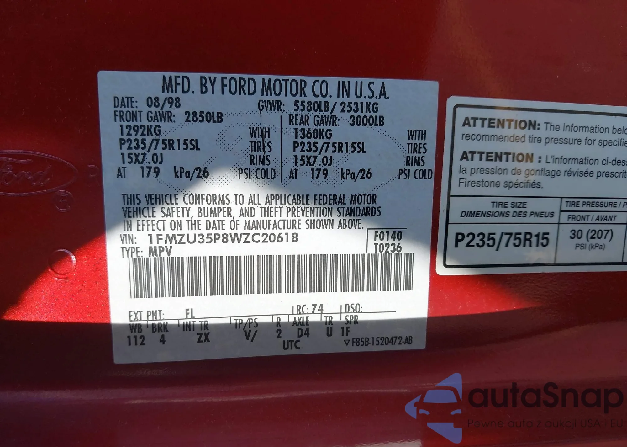 • VIN 1FMZU35P8WZC20618