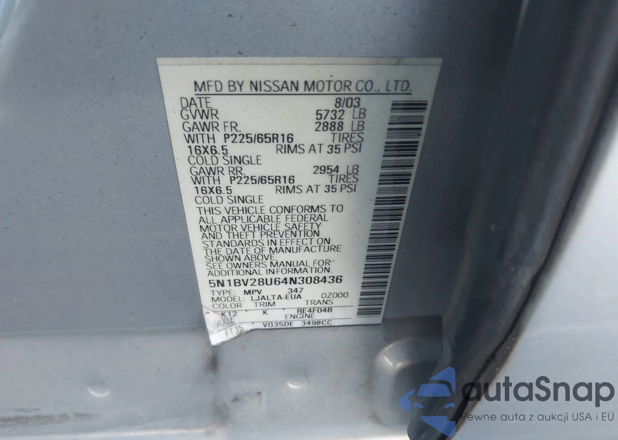 LOT: 42768388 VIN: 5N1BV28U64N308436