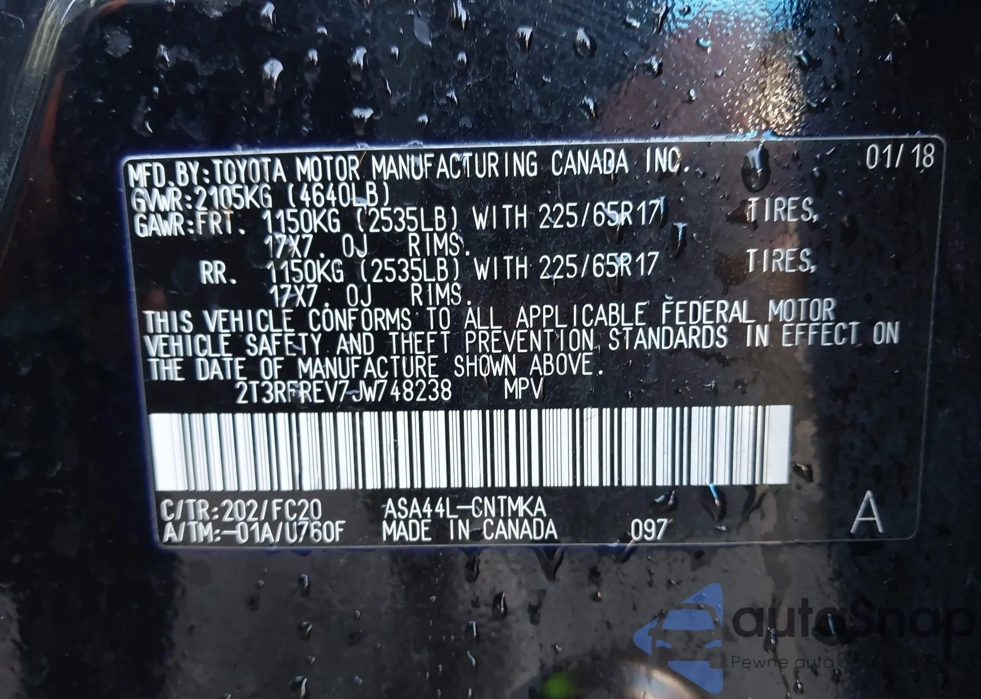 LOT: 43157087 VIN: 2T3RFREV7JW748238