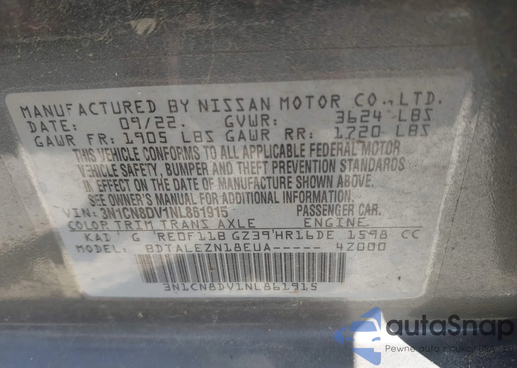 • VIN 3N1CN8DV1NL861915