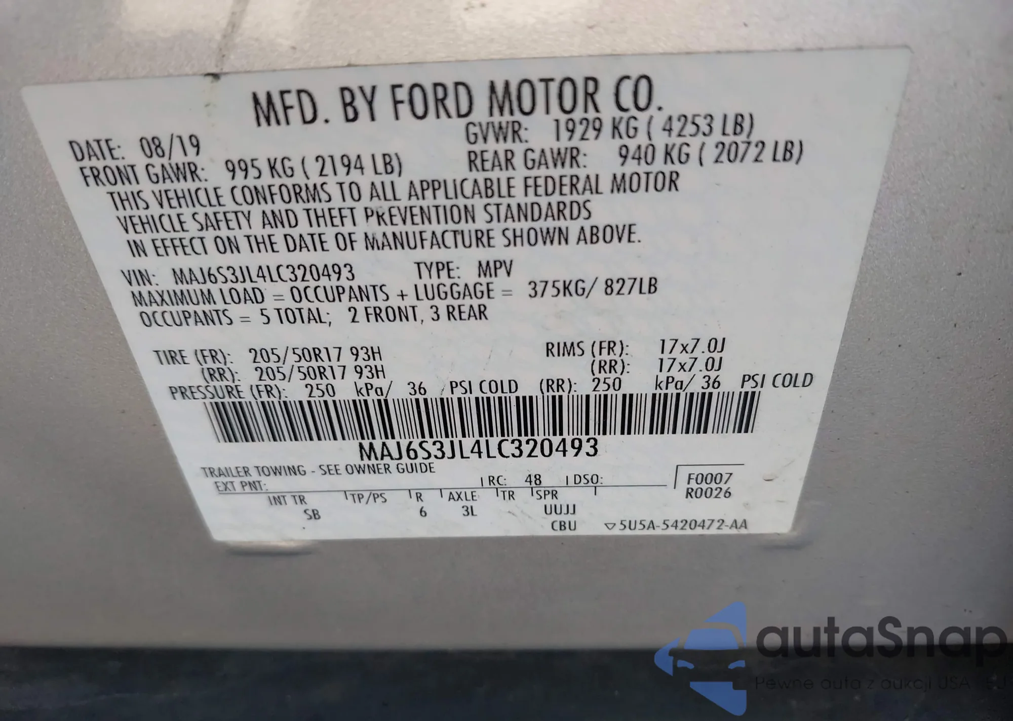 LOT: 42653607 VIN: 5TFCZ5AN6LX228090