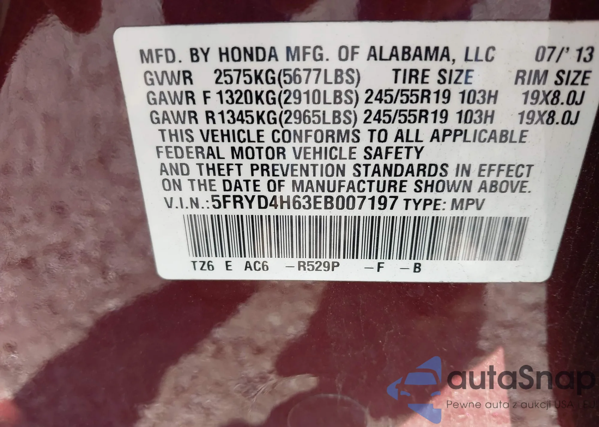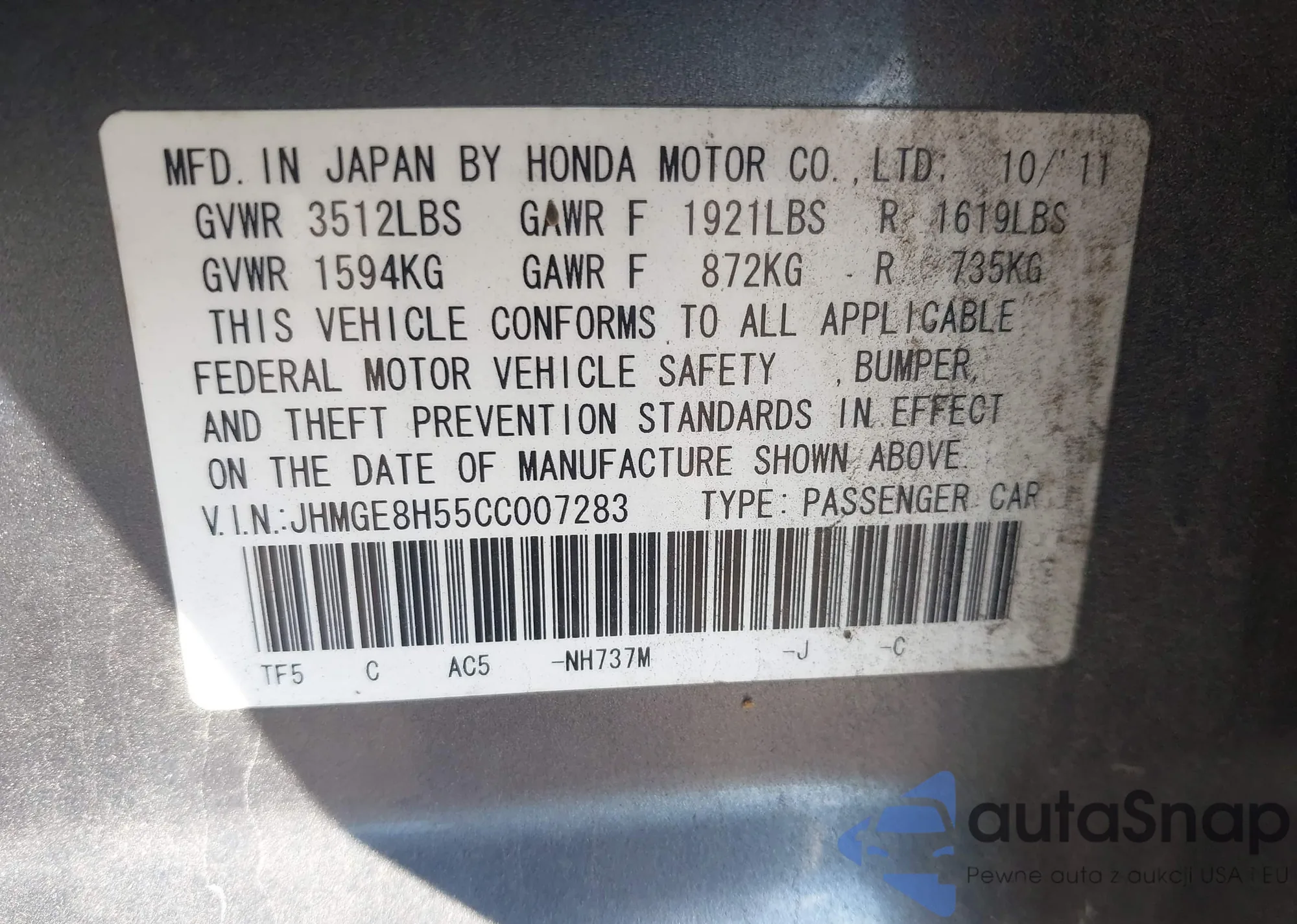 • VIN 5J6TF2H54CL011149