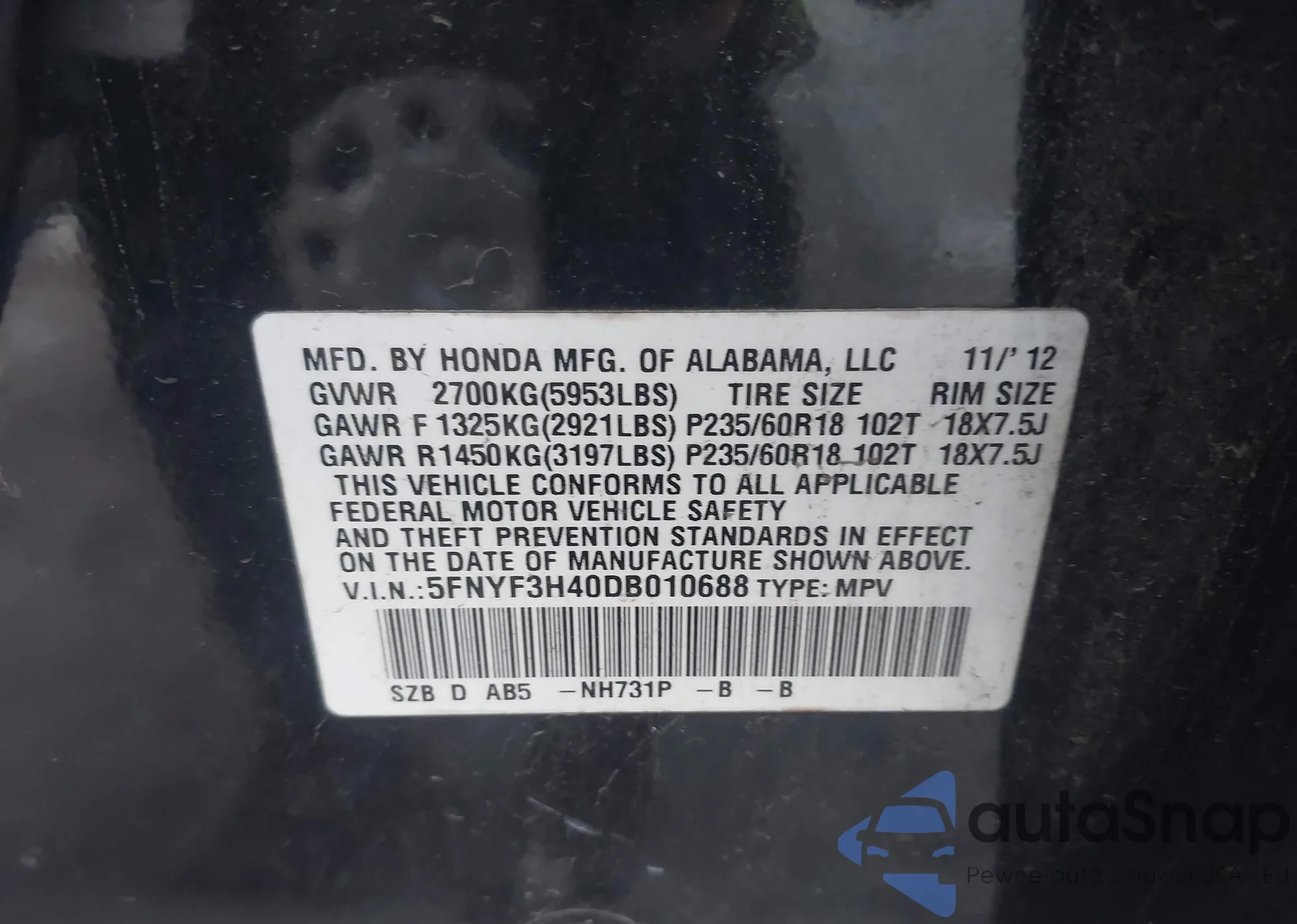 LOT: 43185147 VIN: JHMFE1F78NX010083
