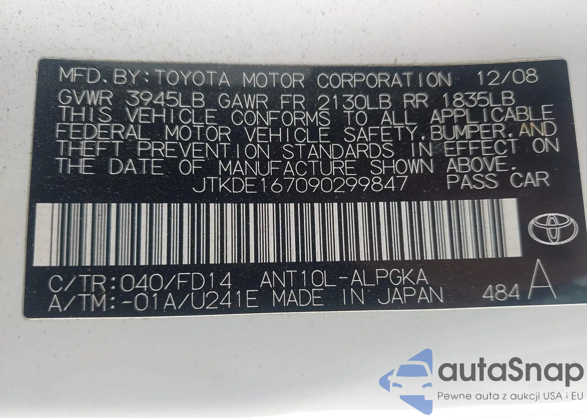 LOT: 43236353 VIN: JTKDE167090299847