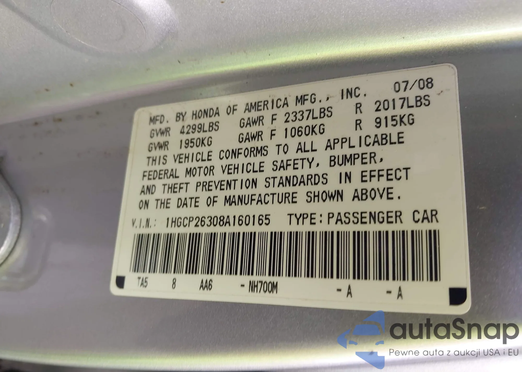 LOT: 43369776 VIN: 1HGCP26308A160165