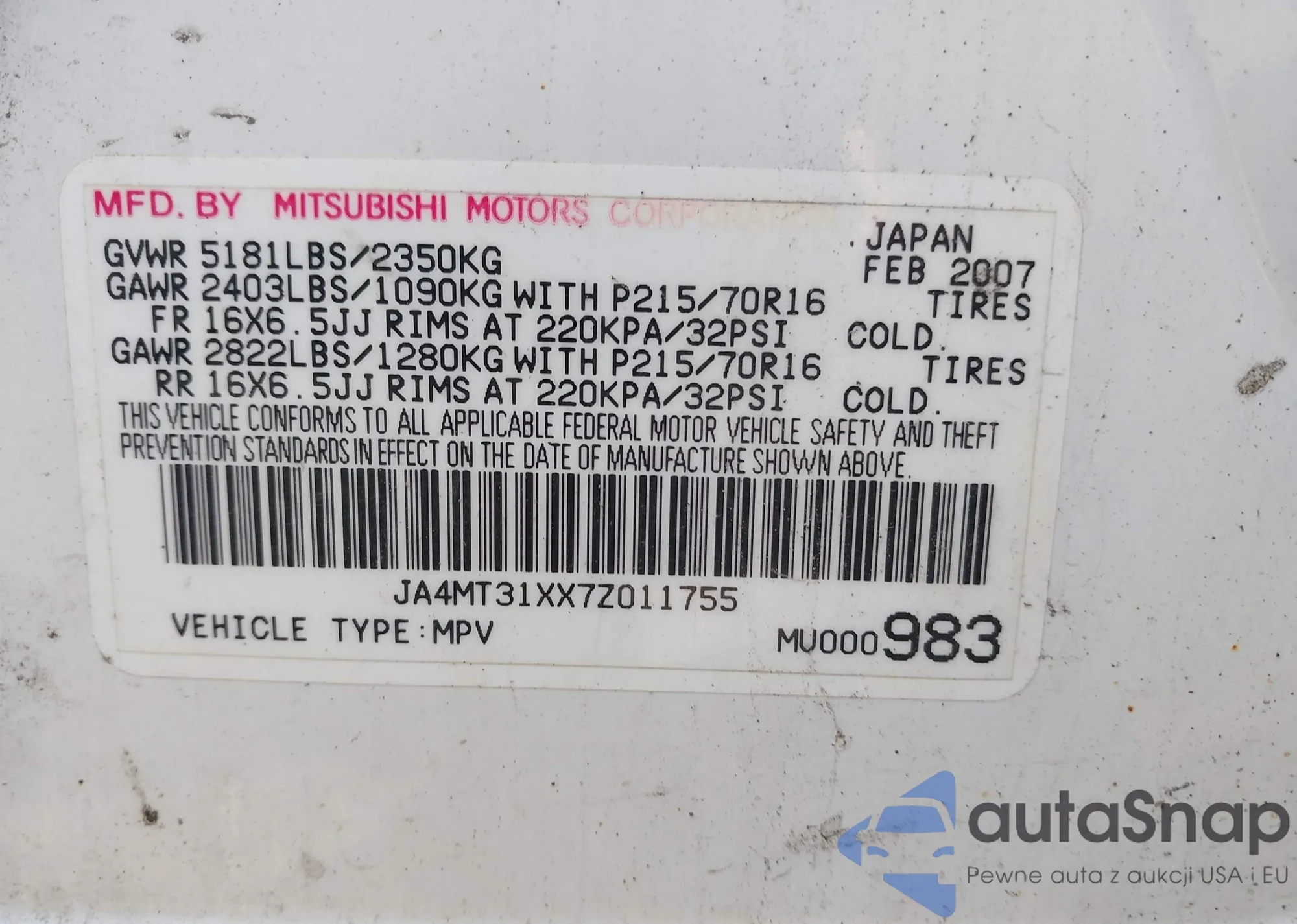 • VIN JA4MT31XX7Z011755