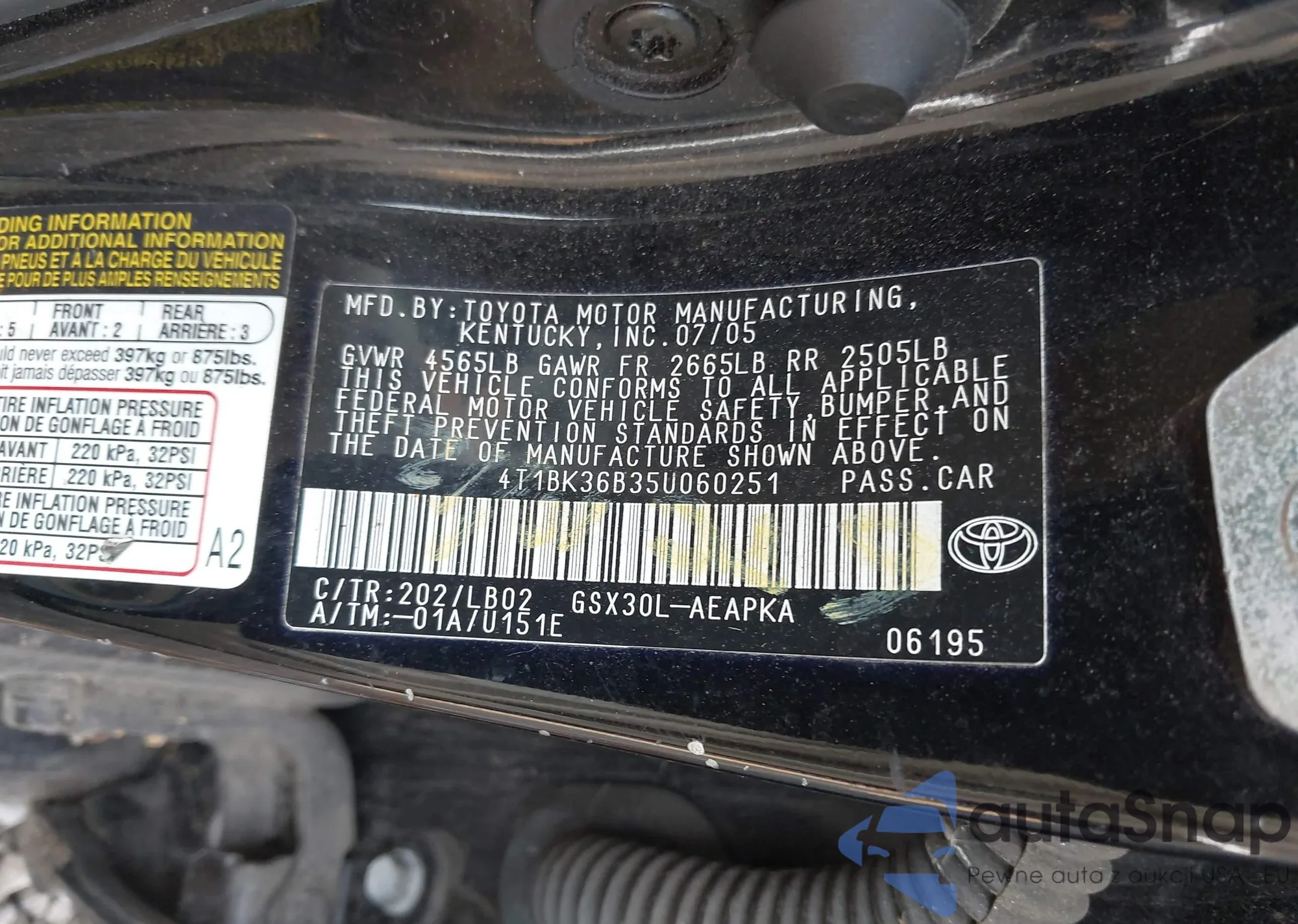 LOT: 42910621 VIN: 4T1BK36B35U060251