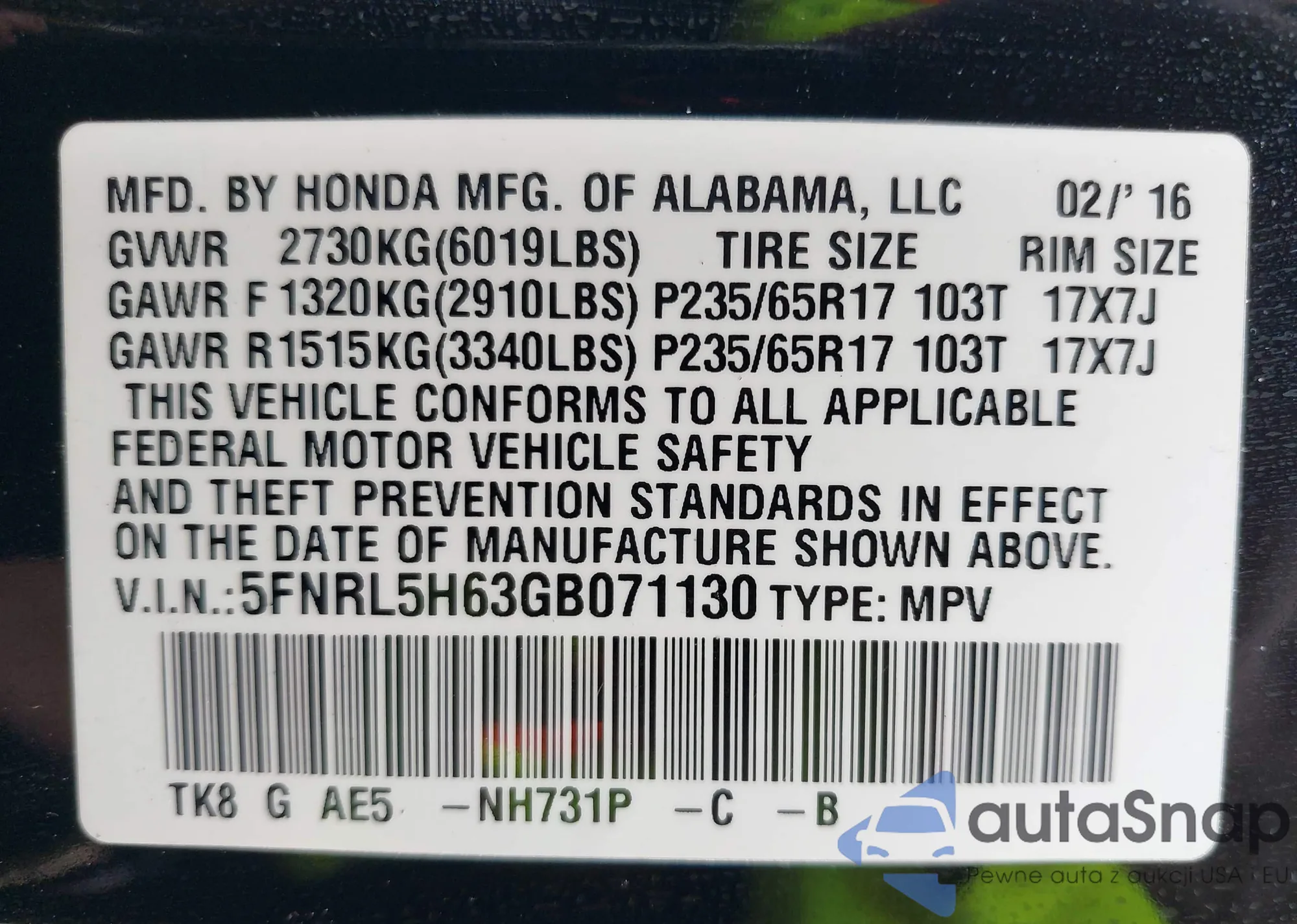 LOT: 43233462 VIN: 5FNRL5H63GB071130