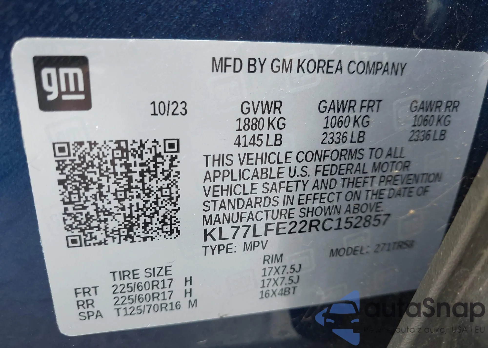• VIN KL77LFE22RC152857