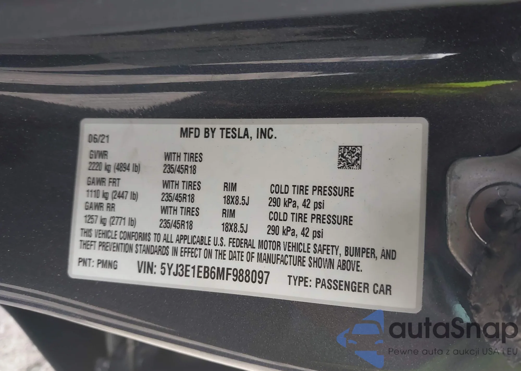 LOT: 43254243 VIN: 5YJ3E1EB6MF988097