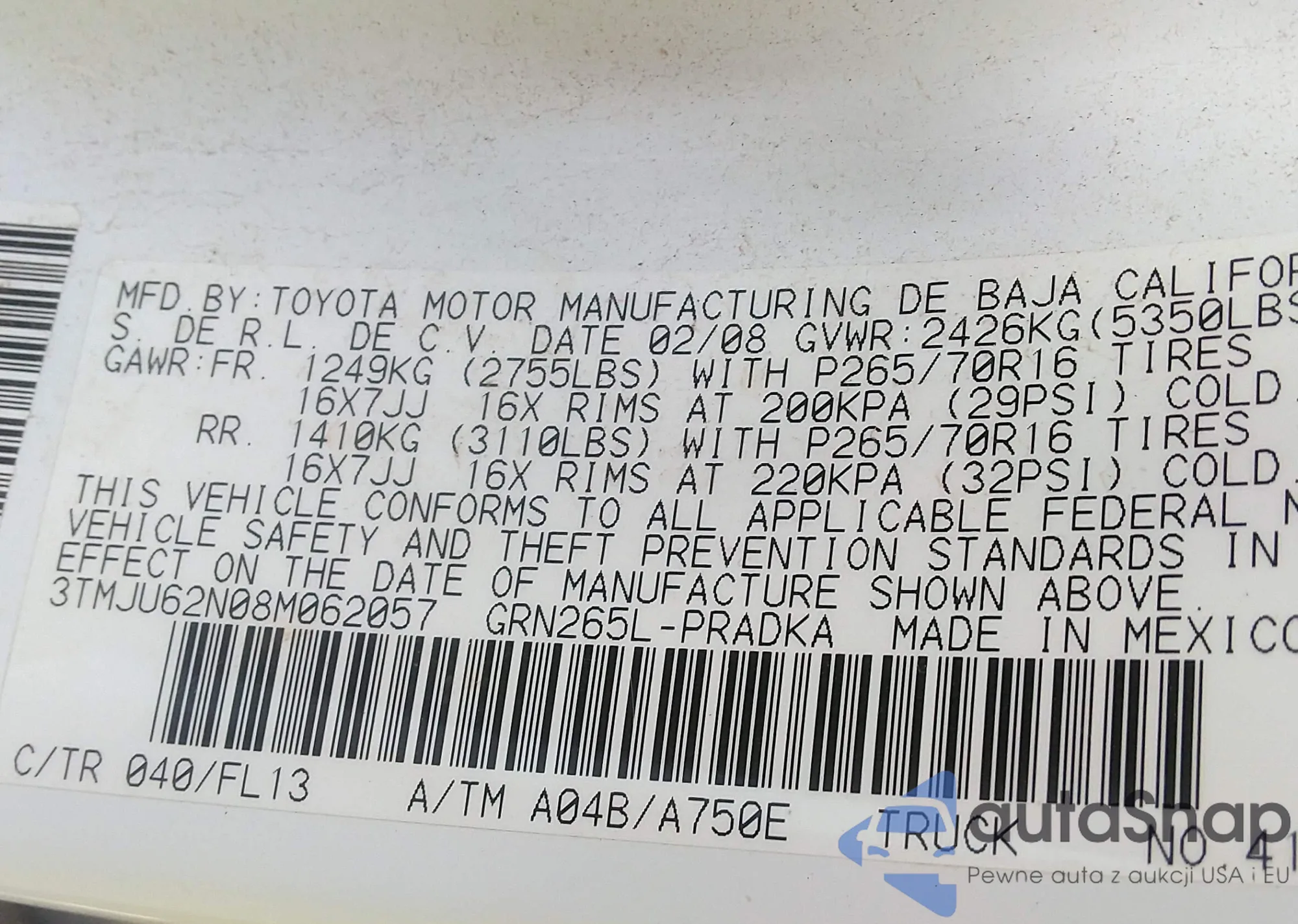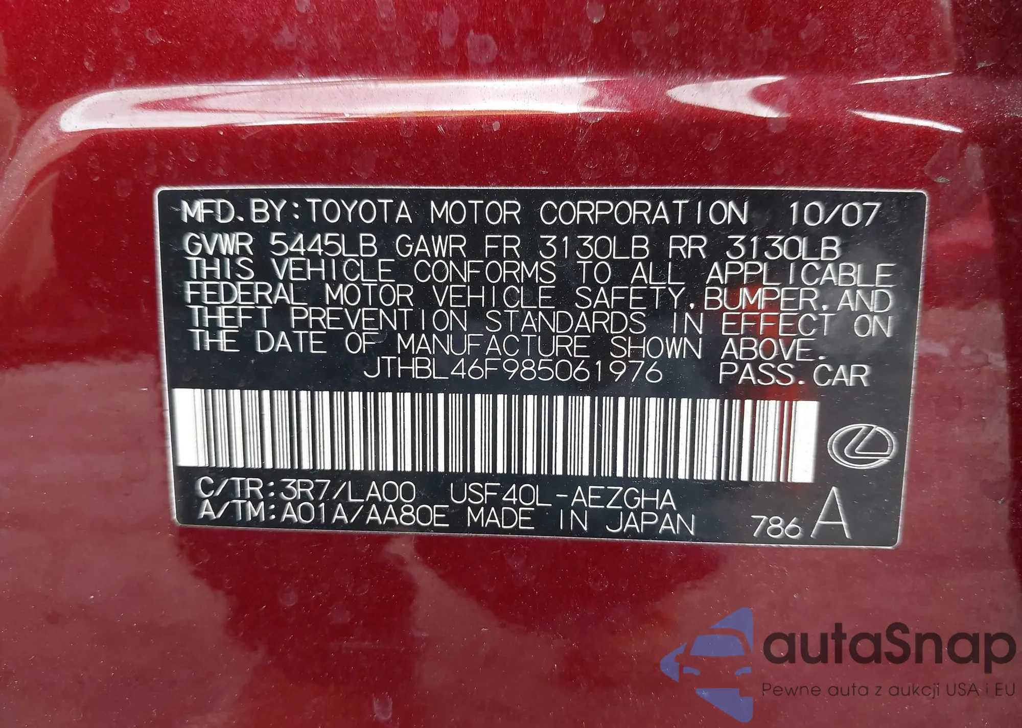 LOT: 43264914 VIN: JTHBL46F985061976