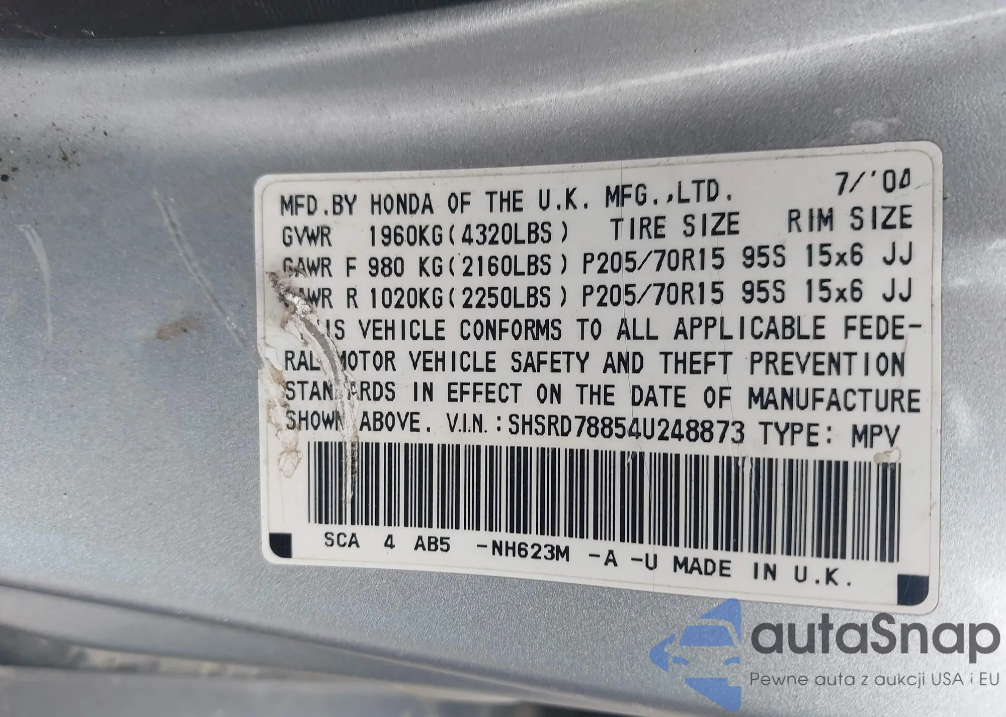 • VIN SHSRD78854U248873