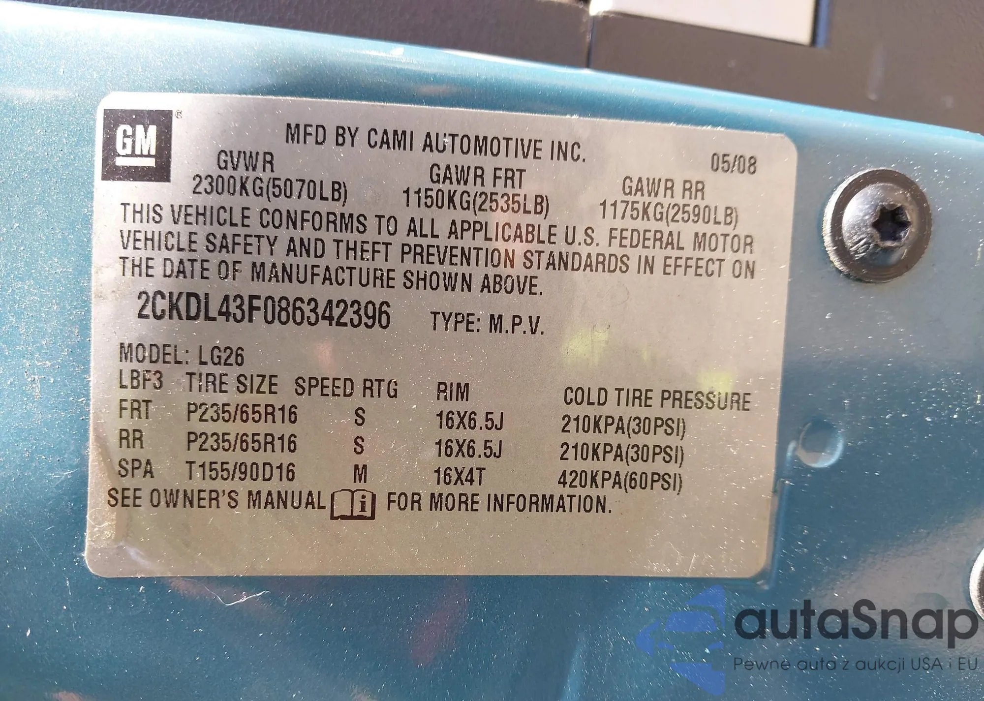 LOT: 42929818 VIN: 2CKDL43F086342396