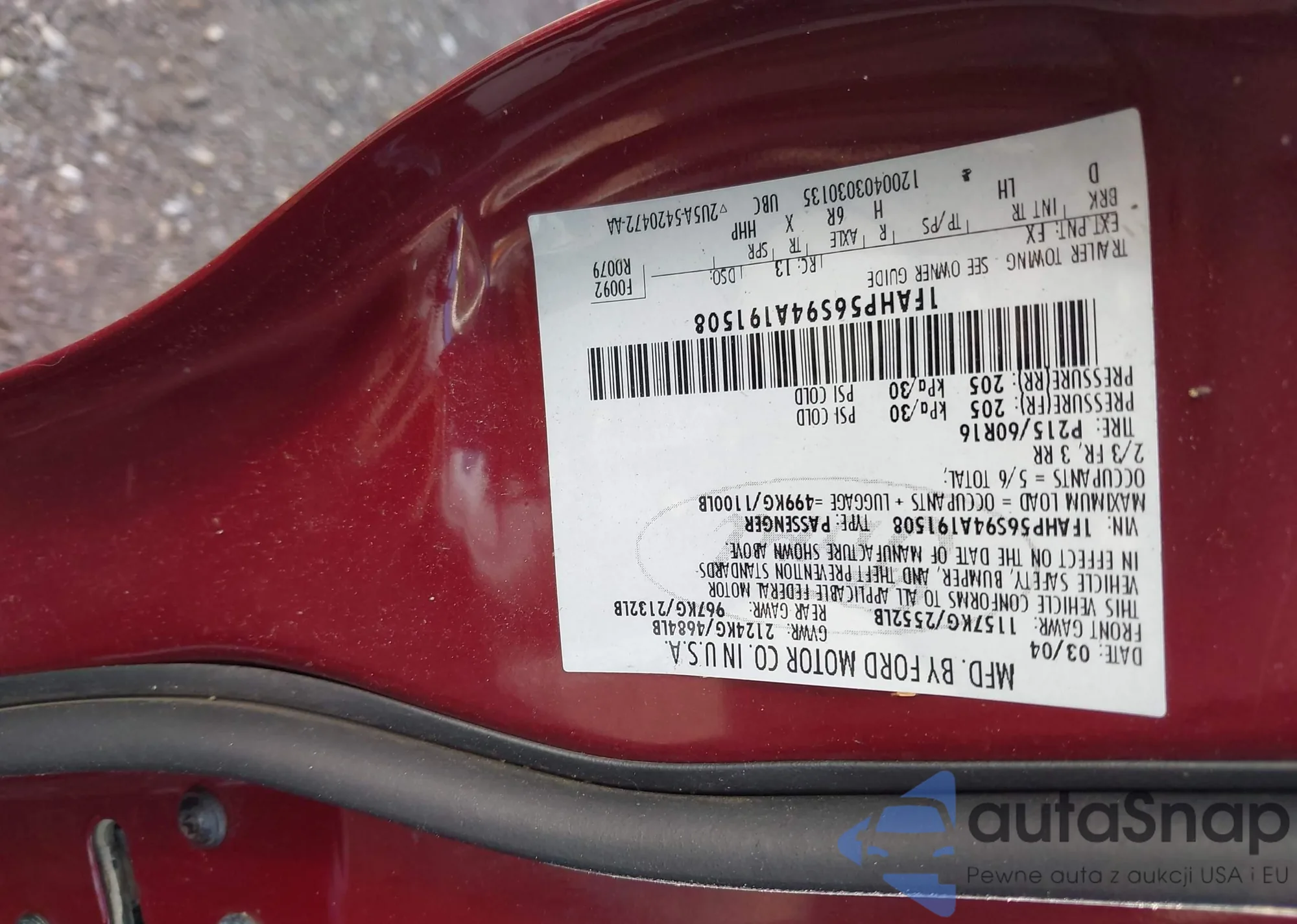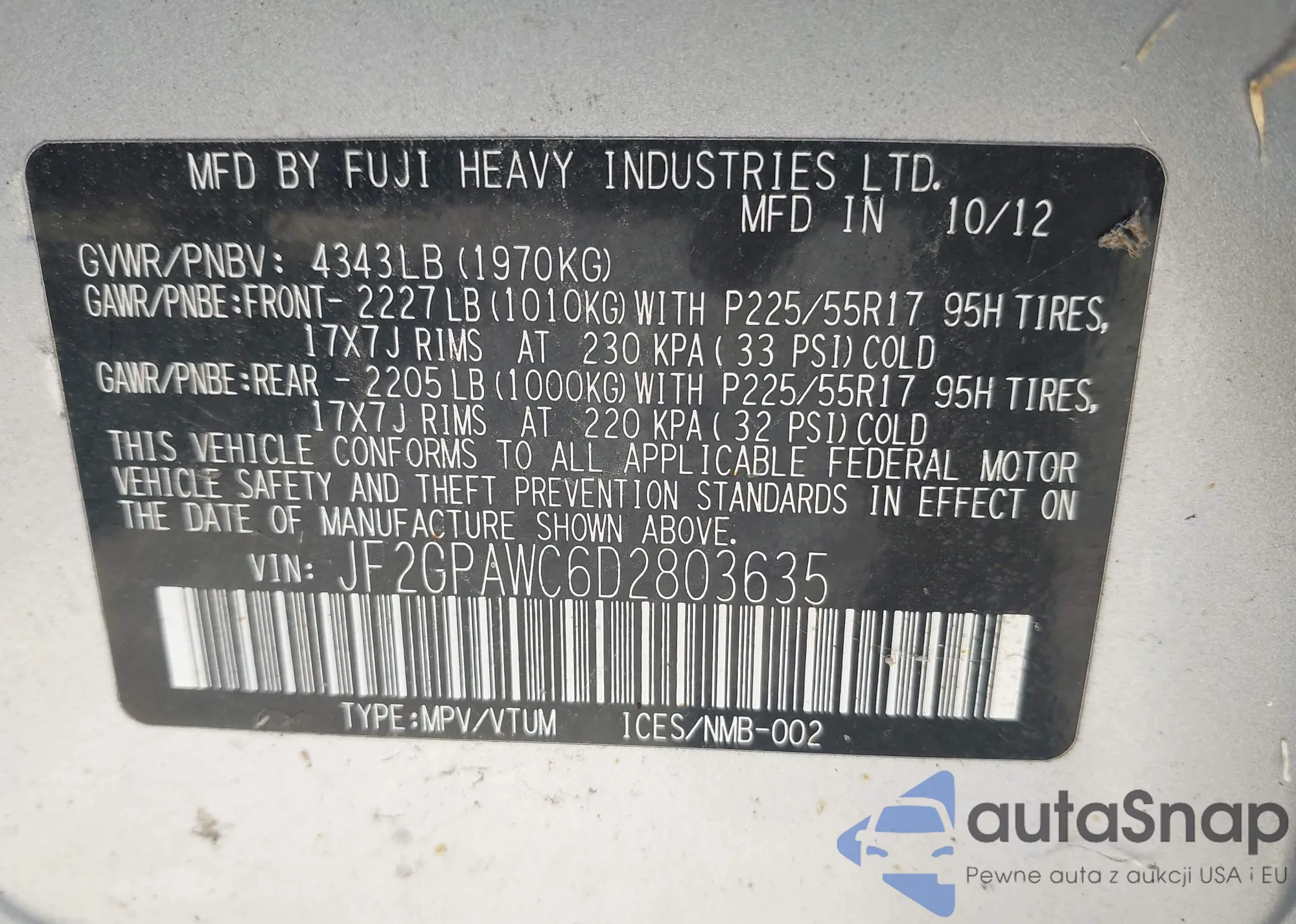 LOT: 43327515 VIN: JF2GPAWC6D2803635