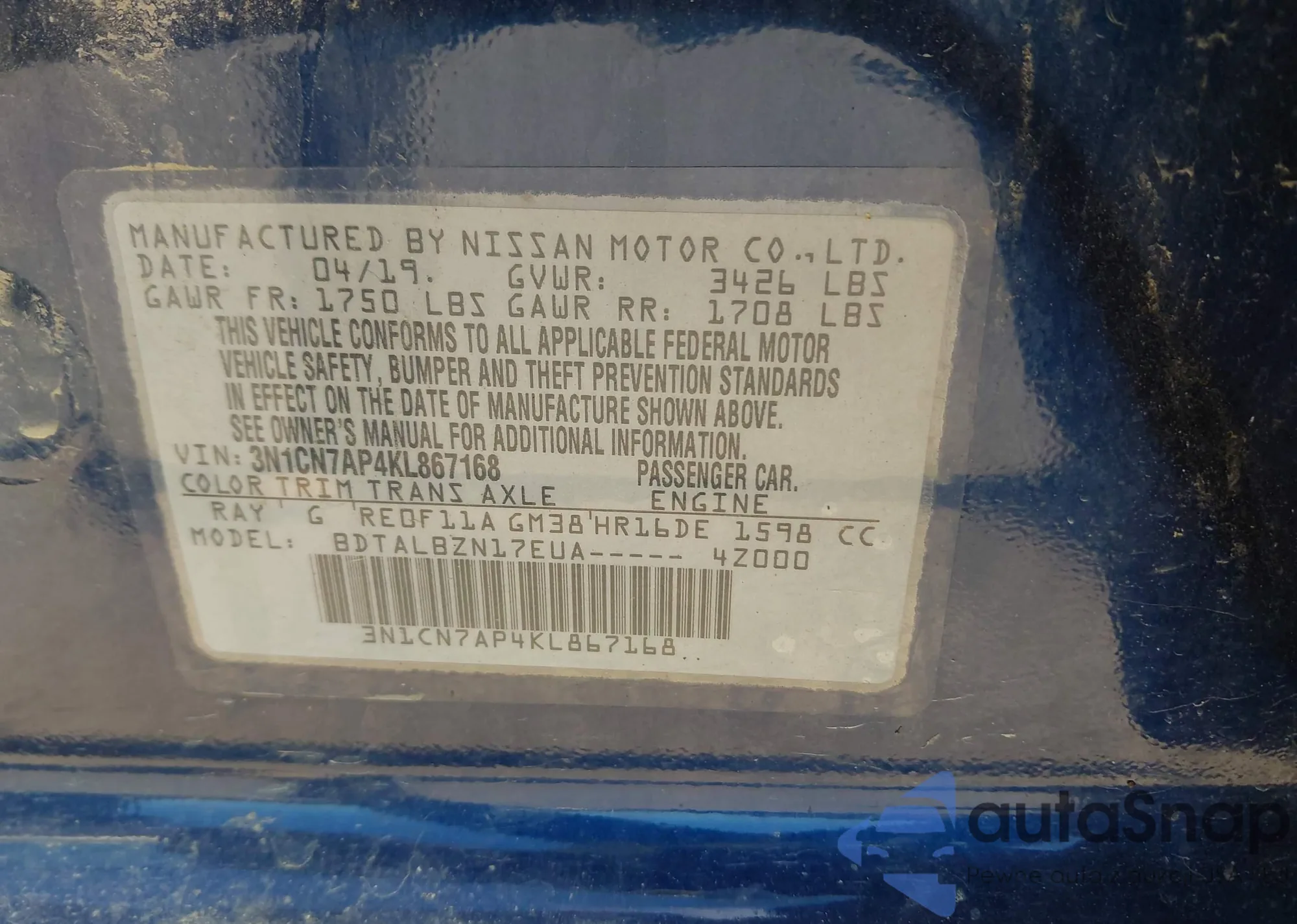 • VIN 3N1CN7AP4KL867168