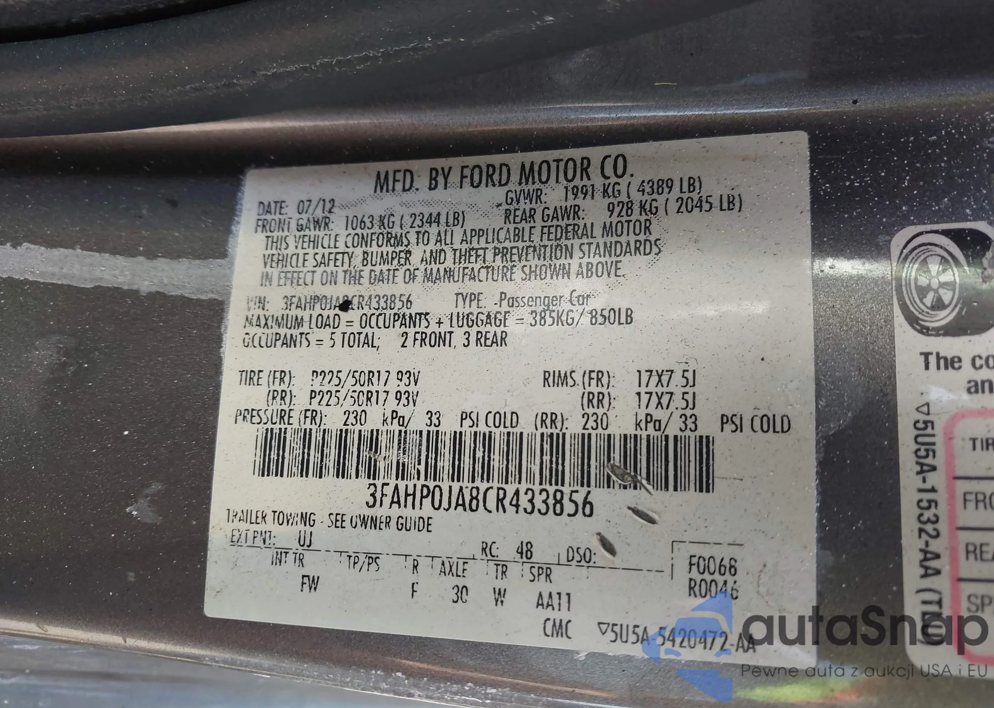 • VIN 3FAHP0JA8CR433856