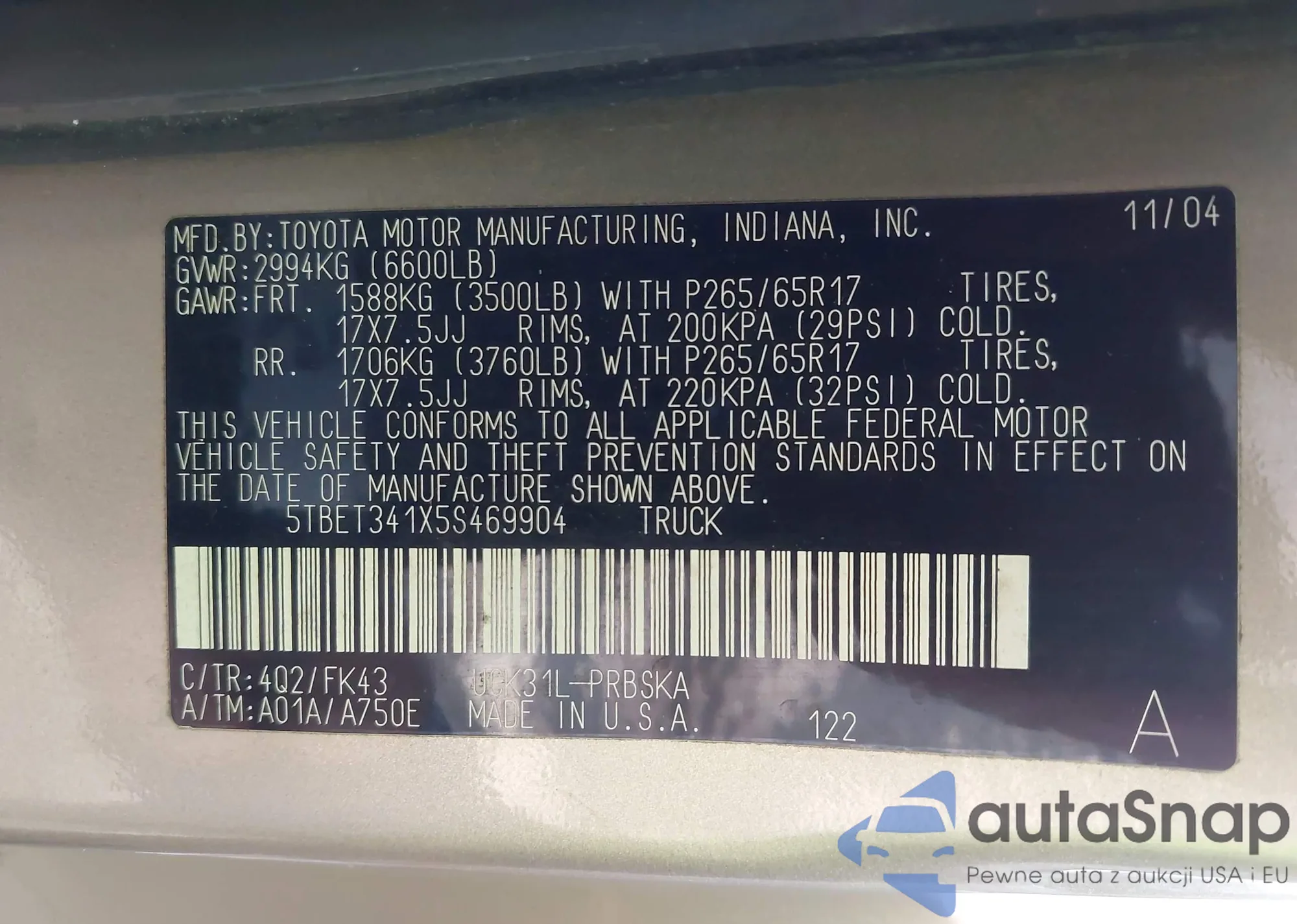 • VIN 5TBET341X5S469904