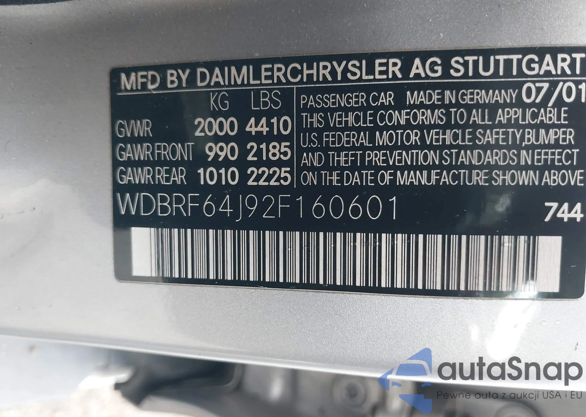 • VIN WDBRF64J92F160601