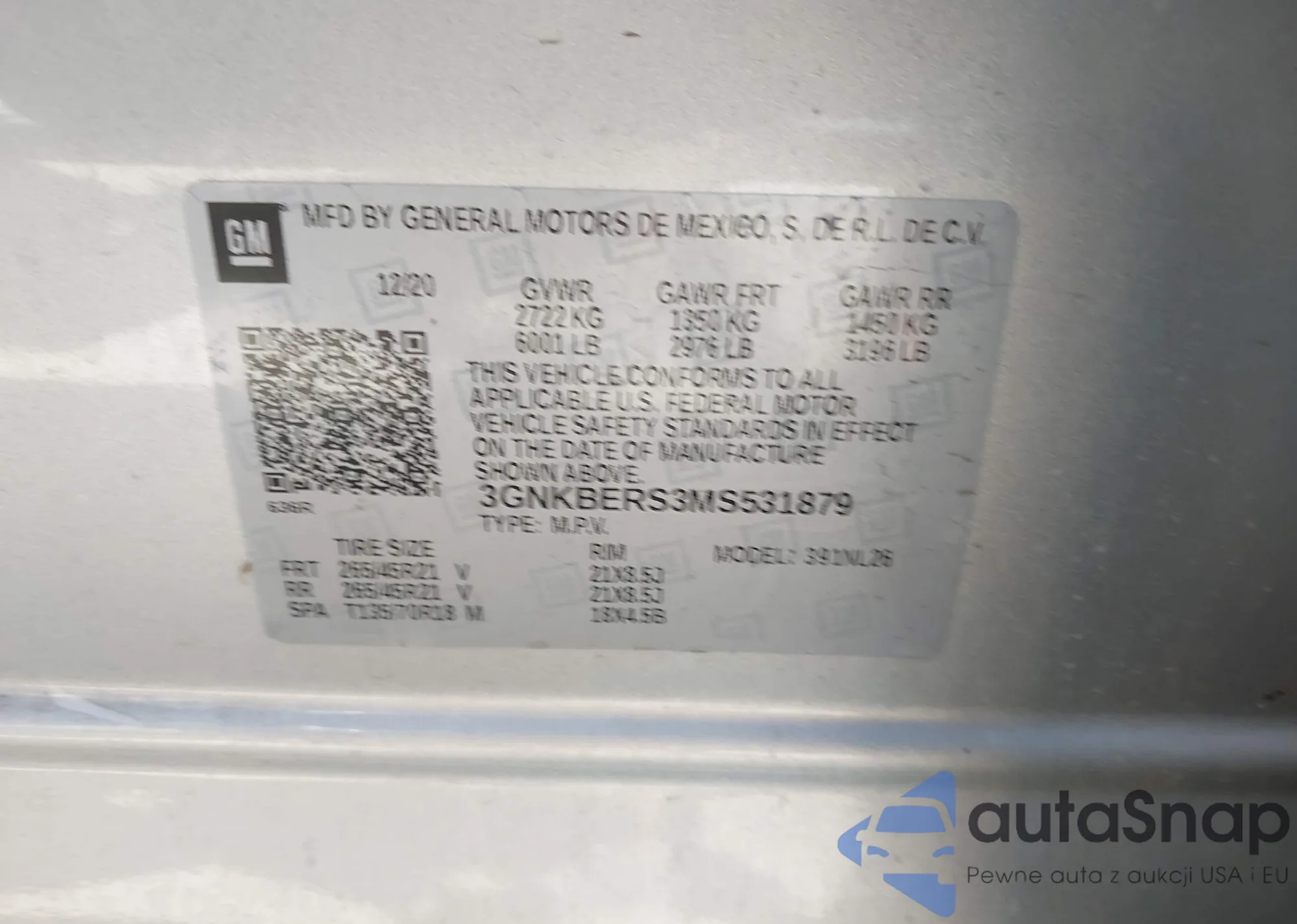 LOT: 43106297 VIN: 3GNKBERS3MS531879