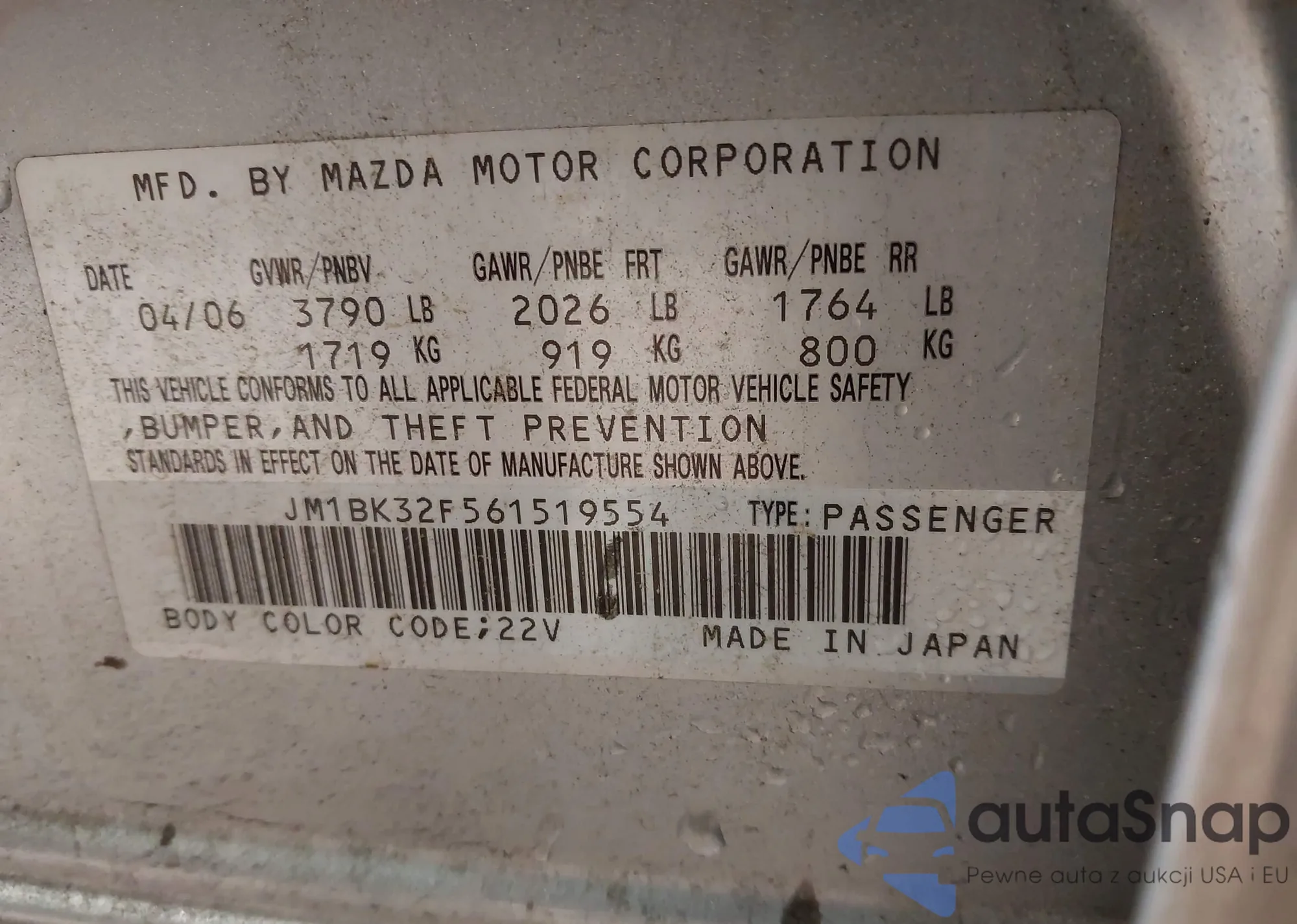 LOT: 43221893 VIN: JM1BK32F561519554