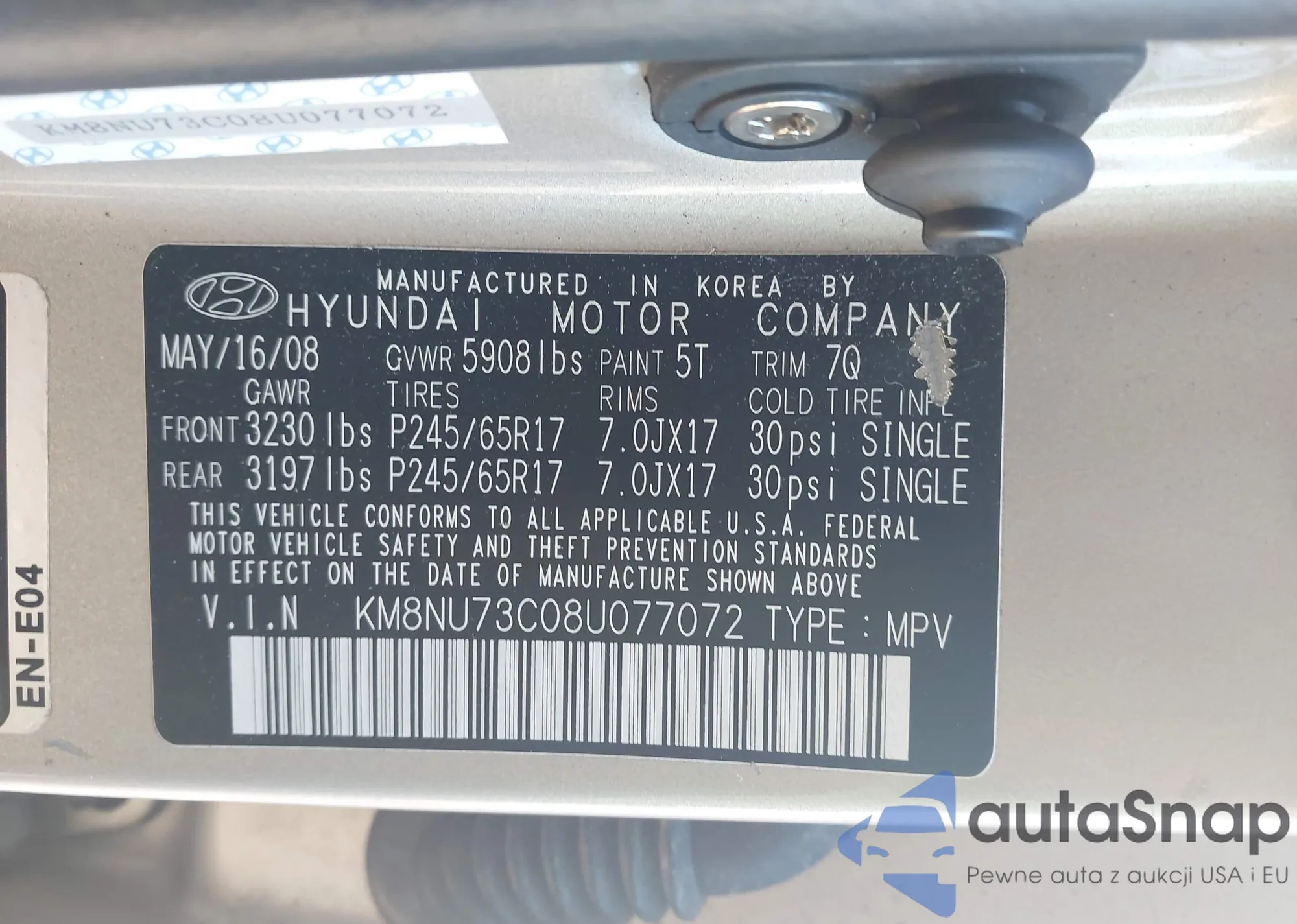 LOT: 43406215 VIN: KM8NU73C08U077072