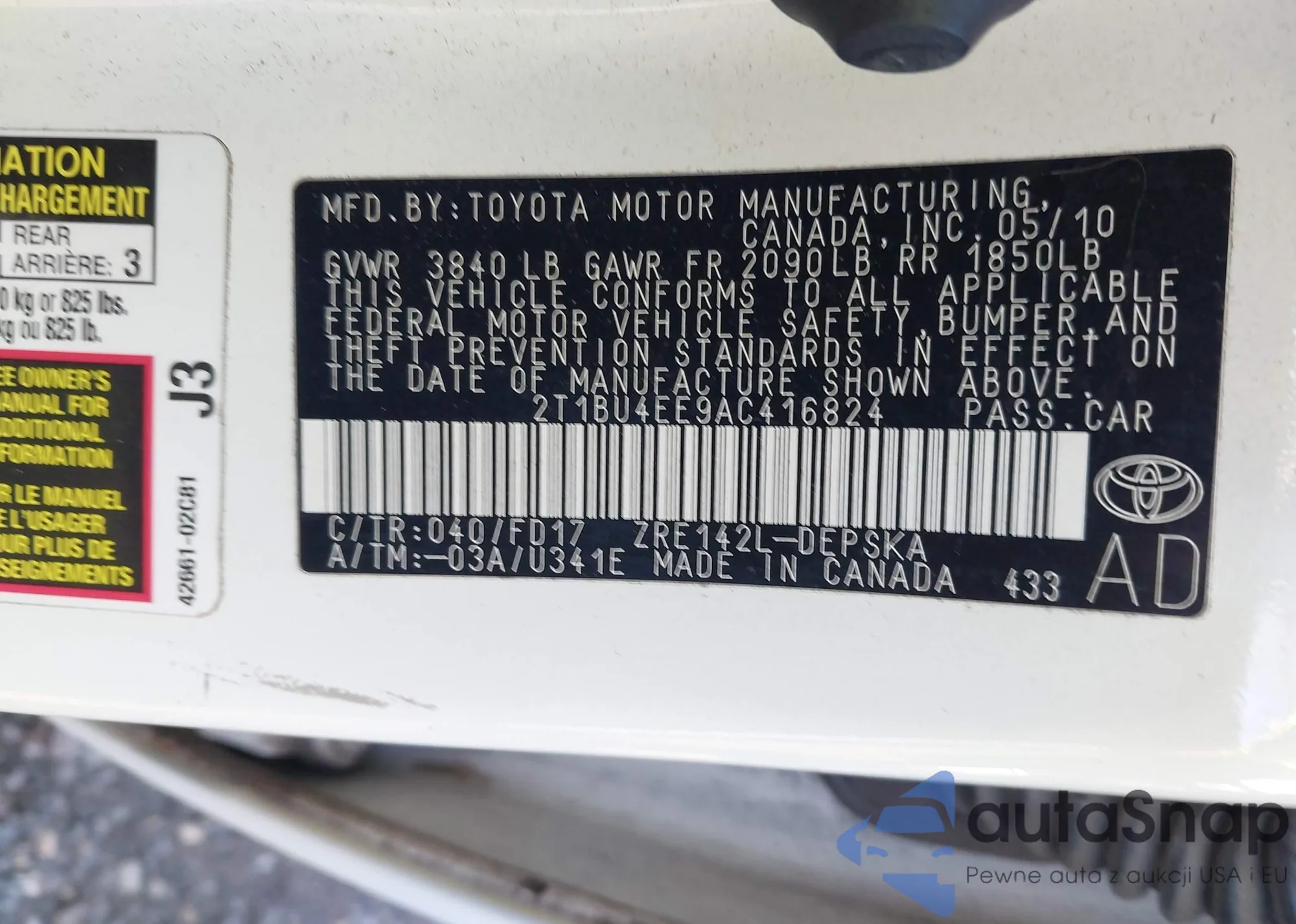 • VIN 2T1BU4EE9AC416824