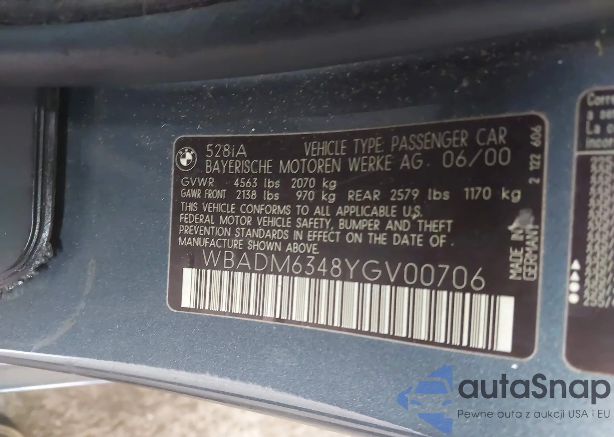 2000 BMW 528Ia из США, поврежденный, VIN WBADM6348YGV00706