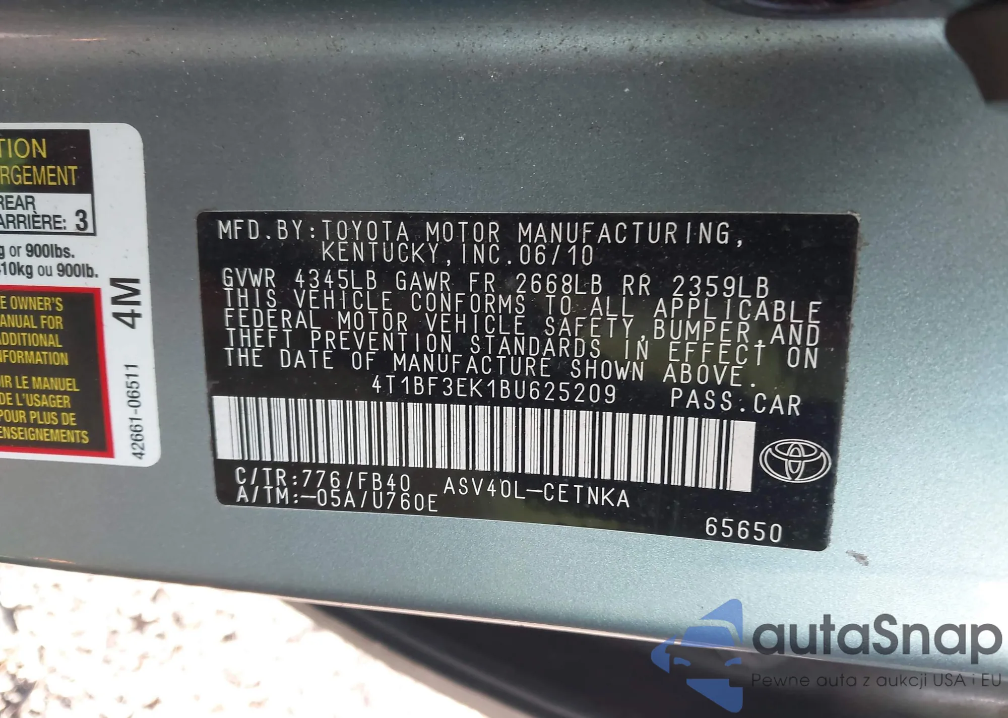 • VIN 4T1BF3EK1BU625209