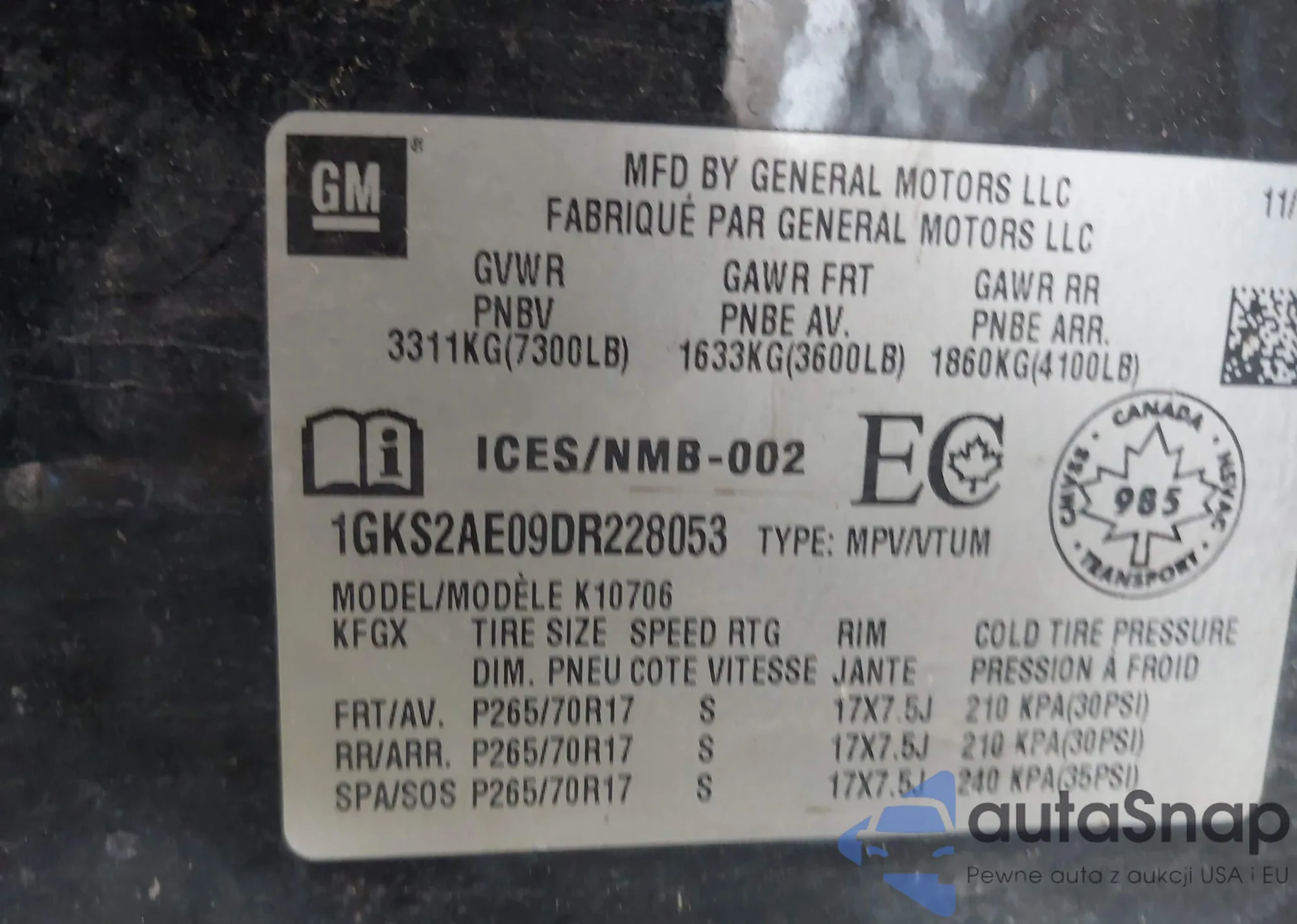 LOT: 43311520 VIN: 1GKS2AE09DR228053