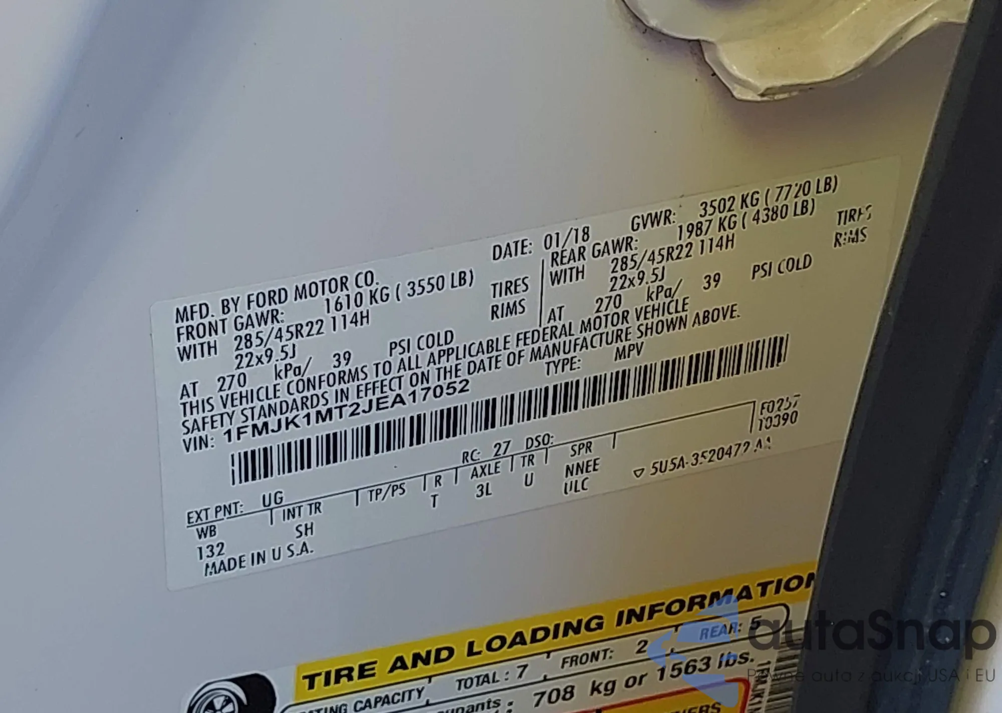 LOT: 43061316 VIN: 1FMJK1MT2JEA17052