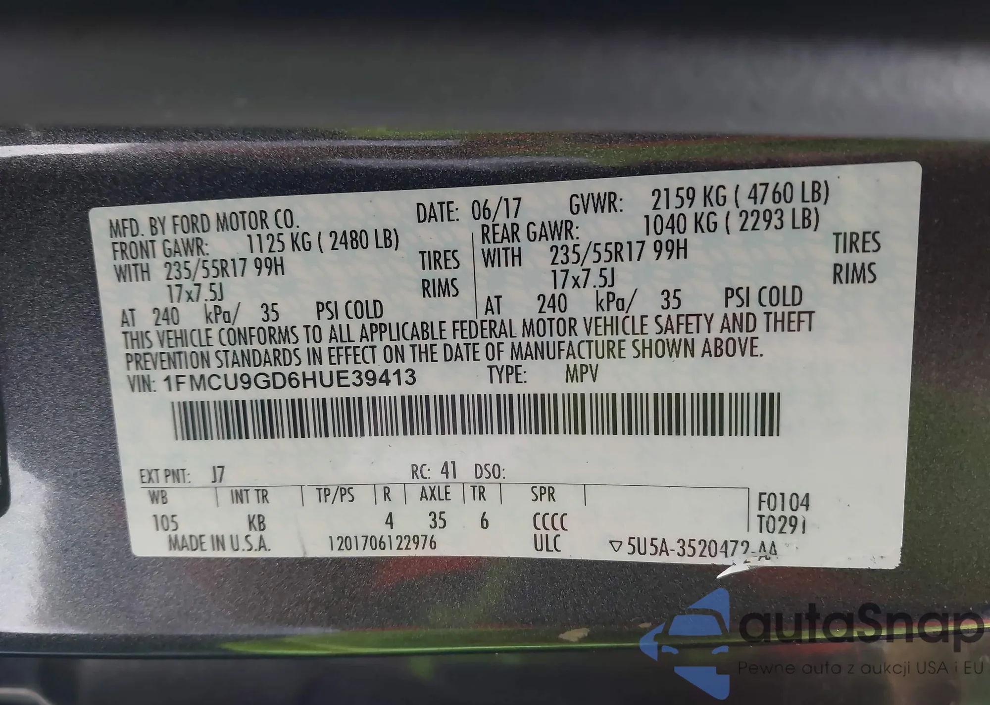 • VIN 1FMCU9GD6HUE39413