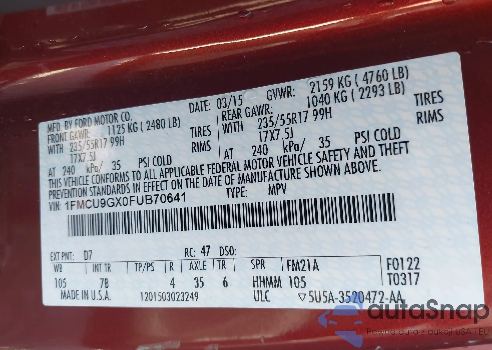 • VIN 1FMCU9GX0FUB70641