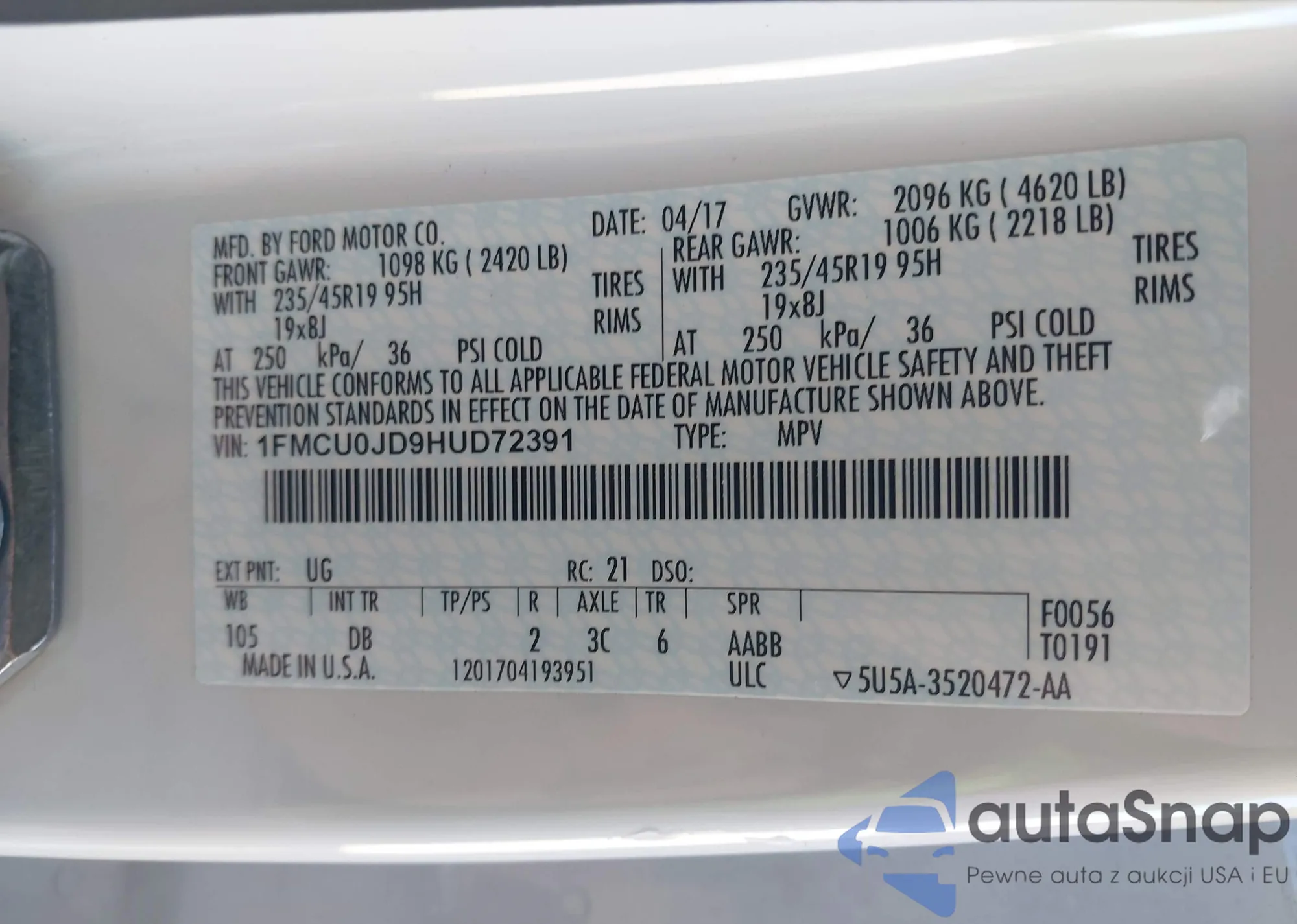 LOT: 43223150 VIN: 1FMCU9GD6HUE39413