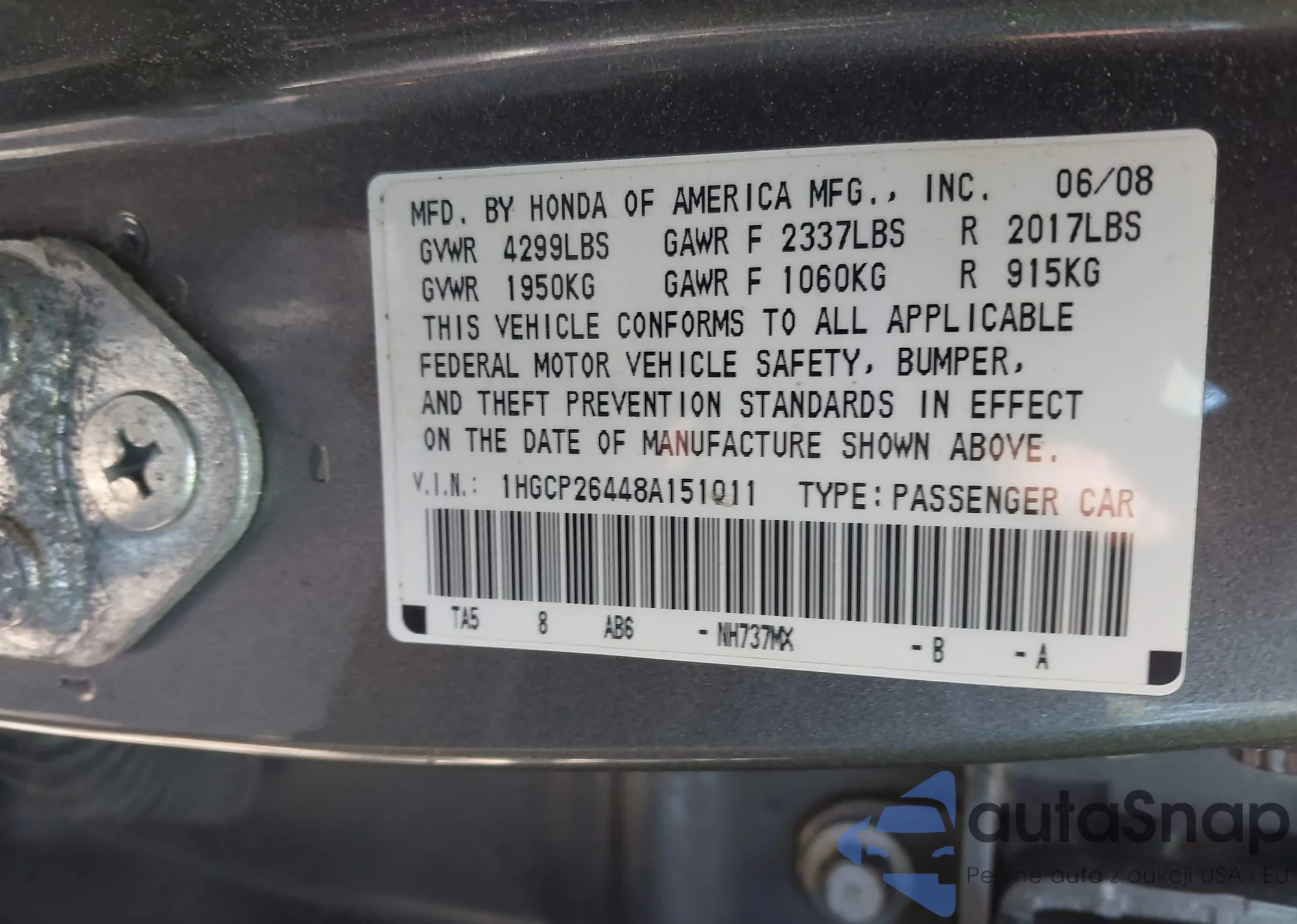 LOT: 43109477 VIN: 1HGCP26448A151011