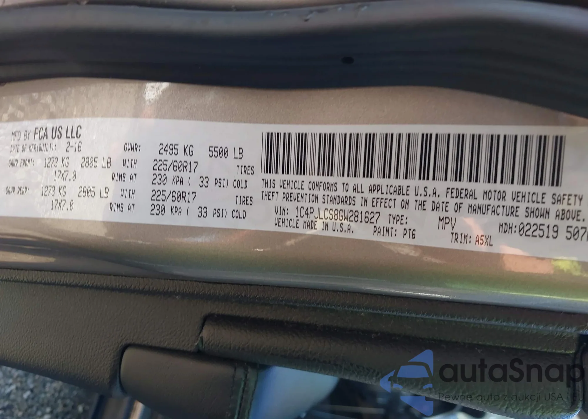 LOT: 43310525 VIN: 1C4PJLCS8GW281627