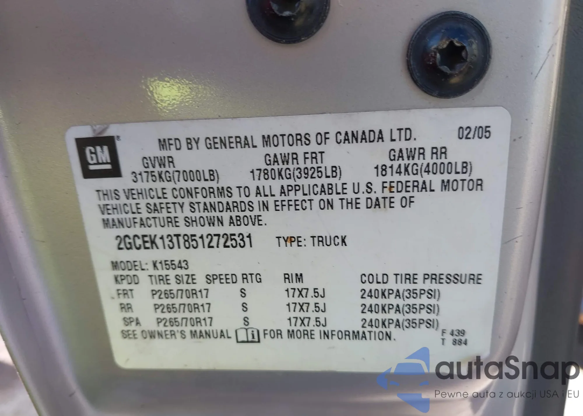 • VIN 2GCEK13T851272531
