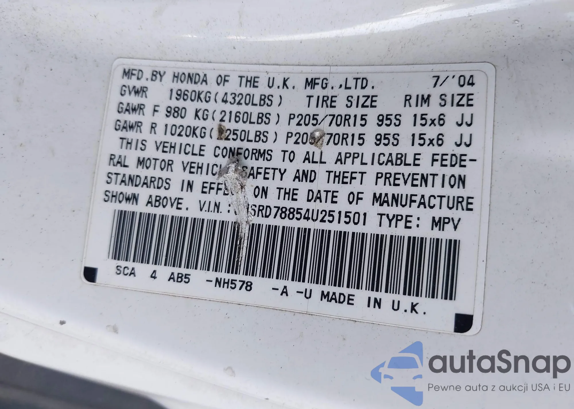 • VIN SHSRD78854U251501