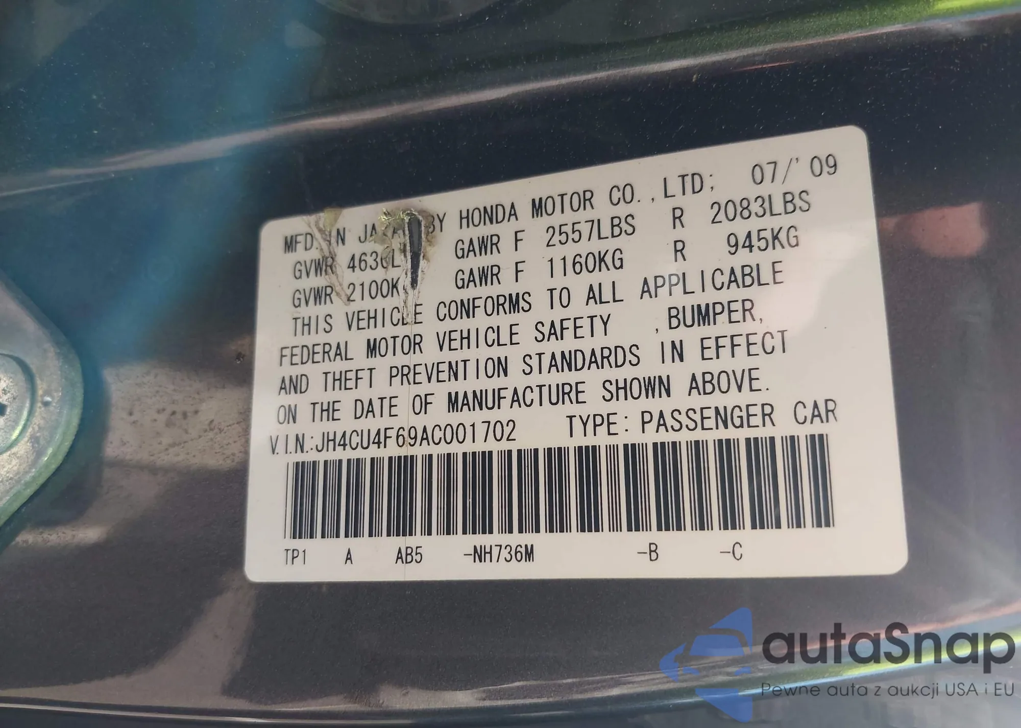 LOT: 43263670 VIN: JH4CU4F69AC001702